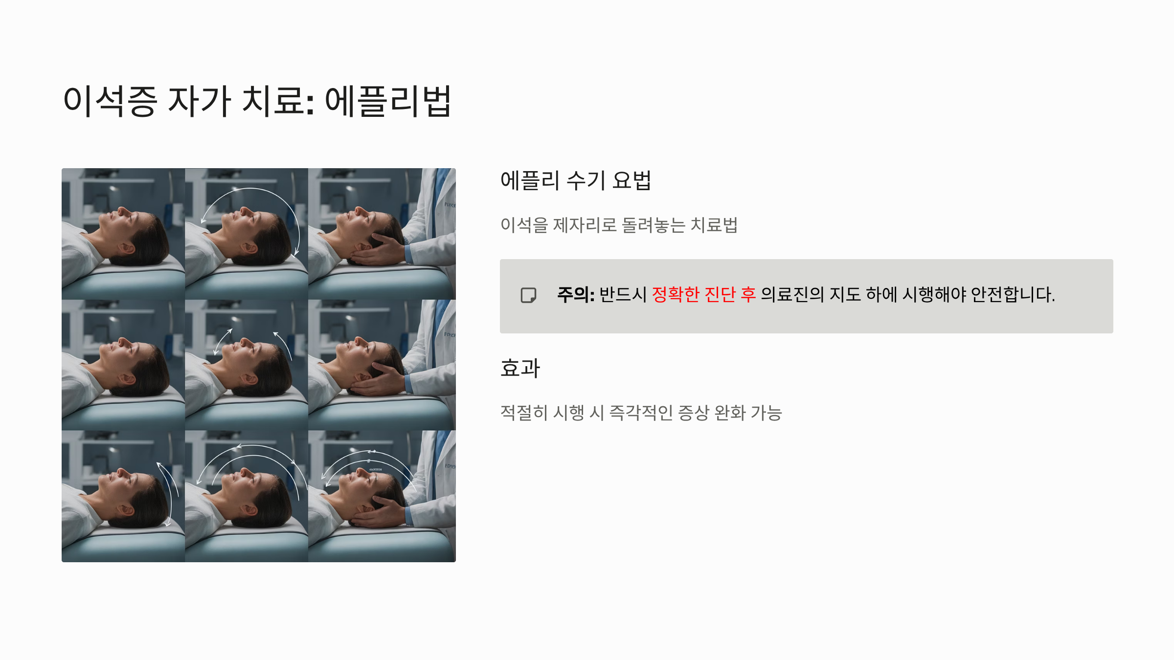 - 이석증 자가 치료 (에플리법): 이석증이 의심될 경우, 이석을 제자리로 돌려놓는 에플리 수기 요법(Epley Maneuver)을 시도할 수 있습니다. 이는 정확한 진단 후 의료진의 지도 하에 시도해야 안전합니다.