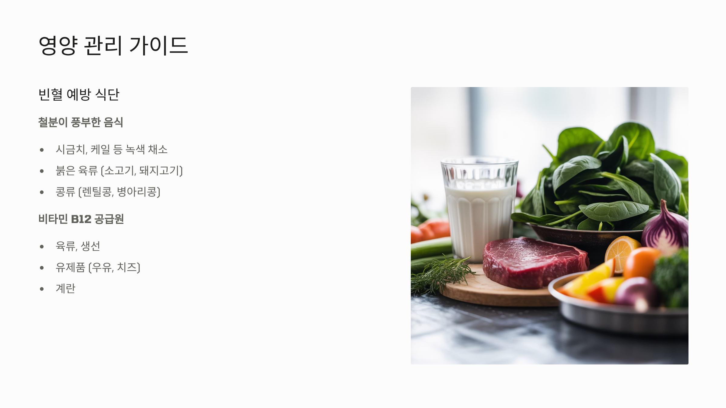 - 규칙적인 식습관 및 영양소 보충: 빈혈이 원인이라면 철분(시금치, 붉은 육류)과 비타민 B12(육류, 유제품)가 풍부한 식단을 섭취해야 합니다.