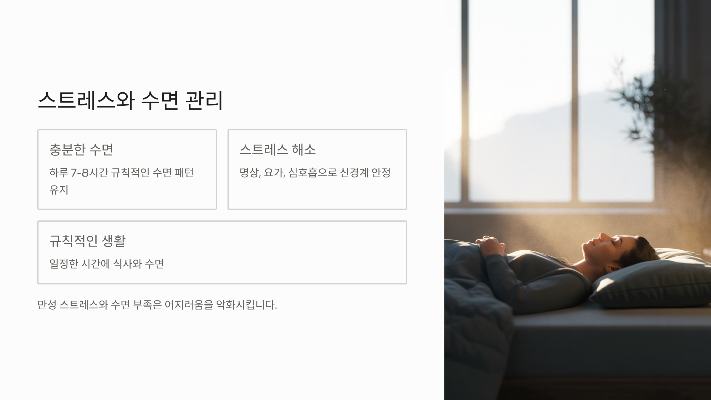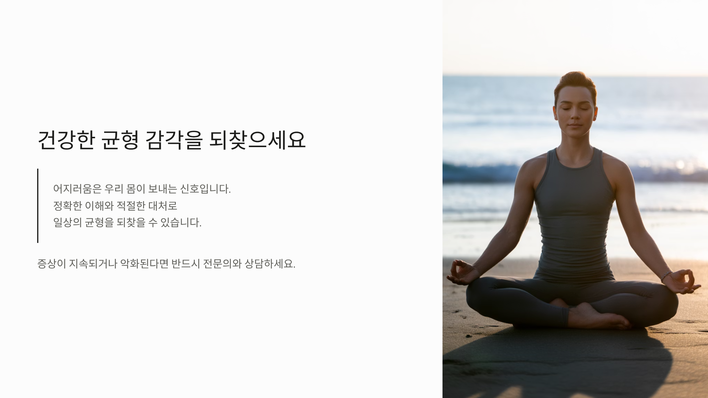 - 스트레스 및 수면 관리: 만성적인 스트레스와 수면 부족은 어지러움 증상을 악화시킵니다. 충분한 휴식을 취하고 명상 등으로 신경계를 안정시켜야 합니다.