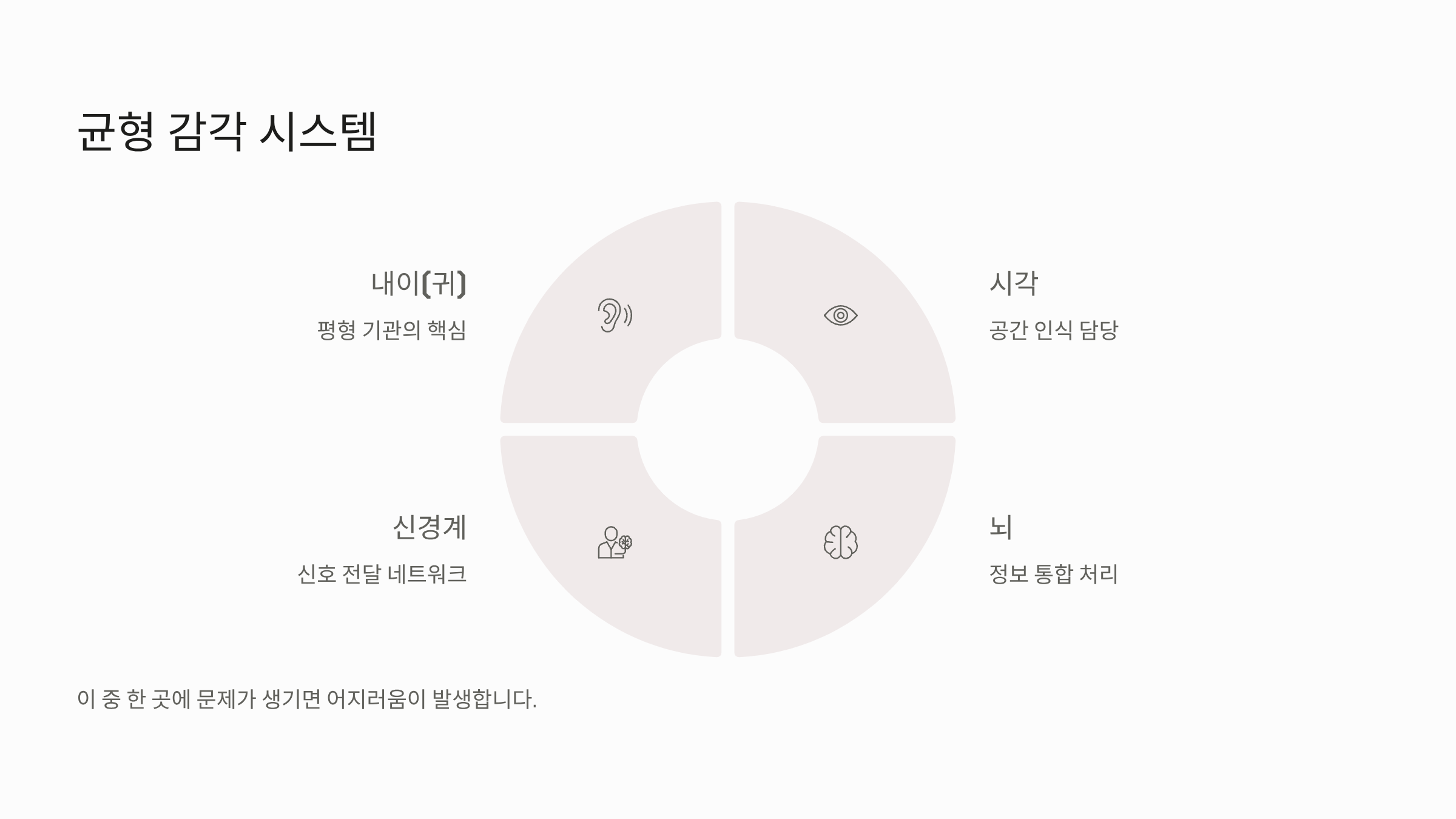 머리가 어지러운 증상은 주로 내이(귀), 심혈관계, 신경계의 문제로 인해 발생합니다.