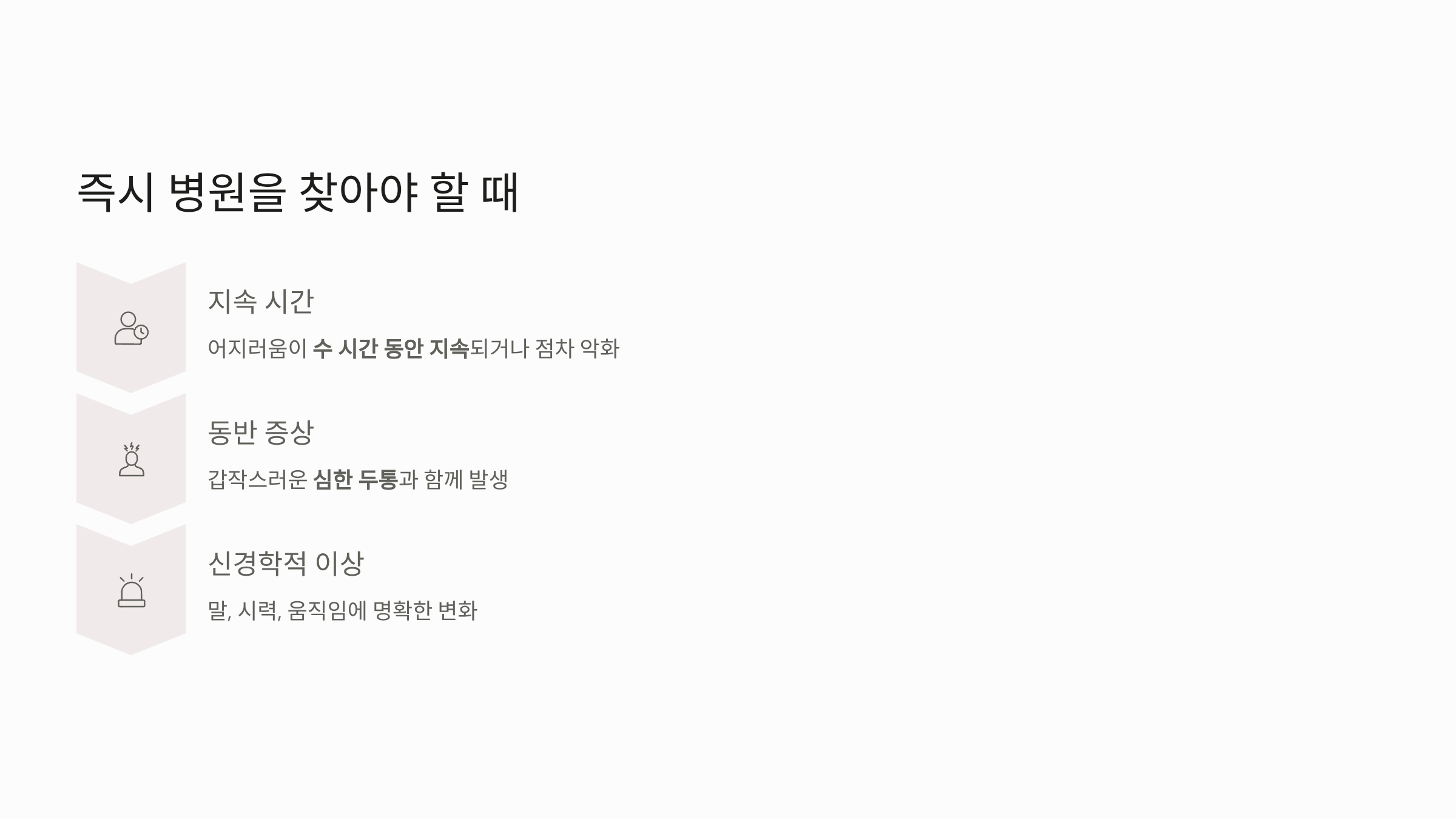 - 신경학적 증상 동반: 말이 어눌해지거나(언어 장애), 팔다리에 힘이 빠지고(마비 증상), 물체가 두 개로 겹쳐 보이거나(시야 장애), 갑작스러운 심한 두통이 동반될 경우 즉시 응급실로 가야 합니다.