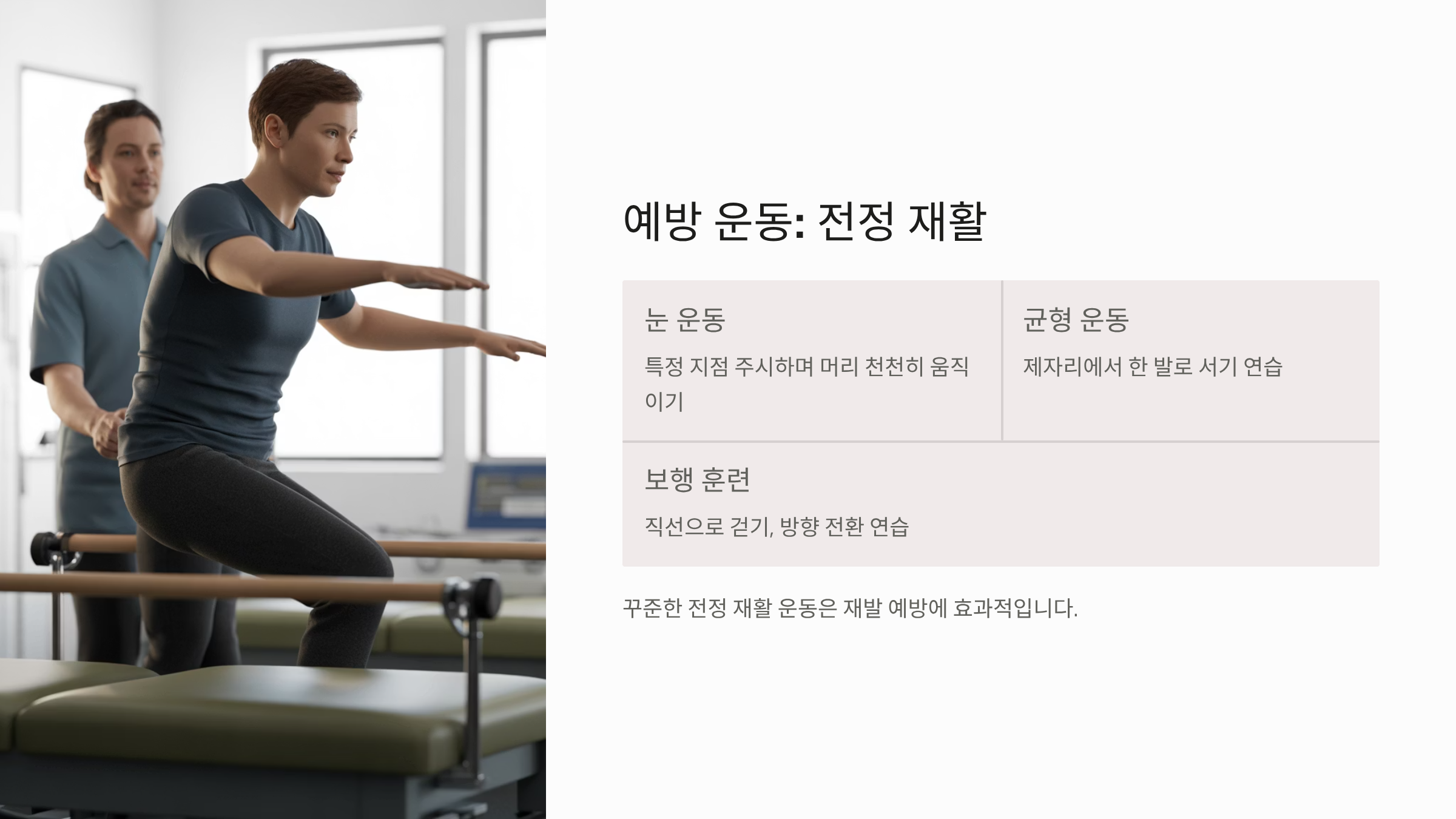 - 어지러움 예방 운동 (전정 재활): 어지러움증이 자주 재발하는 경우, 눈으로 특정 지점을 주시하며 머리를 천천히 움직이거나, 제자리에서 균형을 잡는 등 전정기관의 기능을 회복시키는 재활 운동을 꾸준히 하는 것이 예방에 도움이 됩니다.