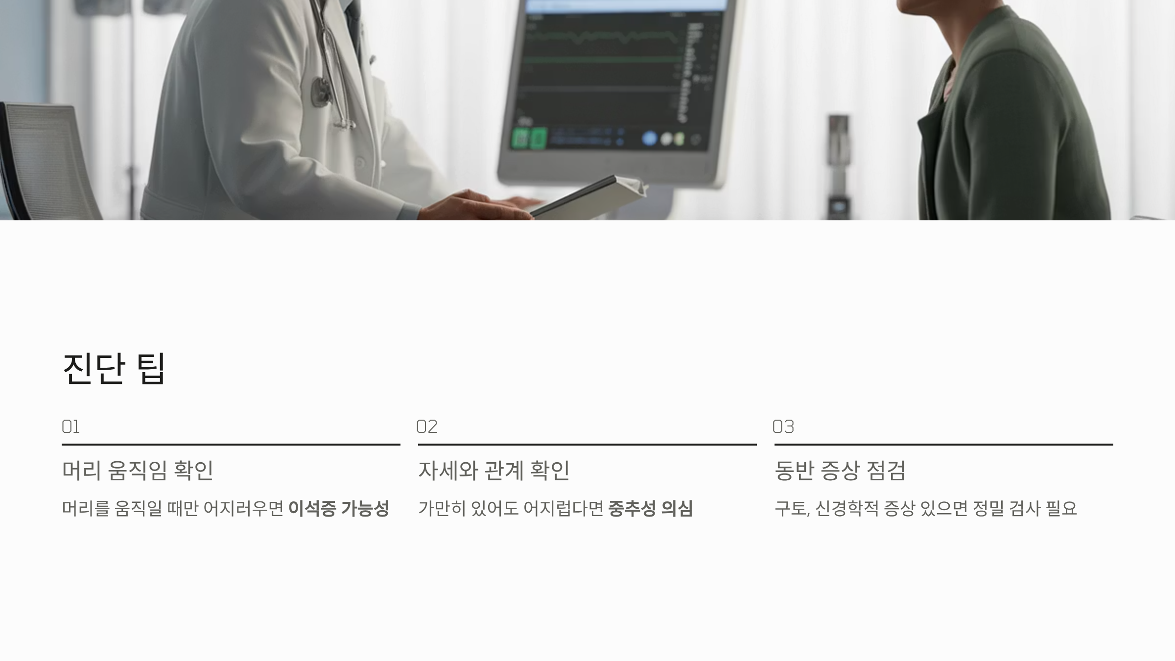 진단 팁: 머리를 움직일 때만 어지러움이 심해지면 이석증일 가능성이 높고, 가만히 있어도 어지럽고 구토가 심하며 신경학적 증상이 동반되면 뇌 문제일 가능성이 높아 정밀 진단이 필요합니다.