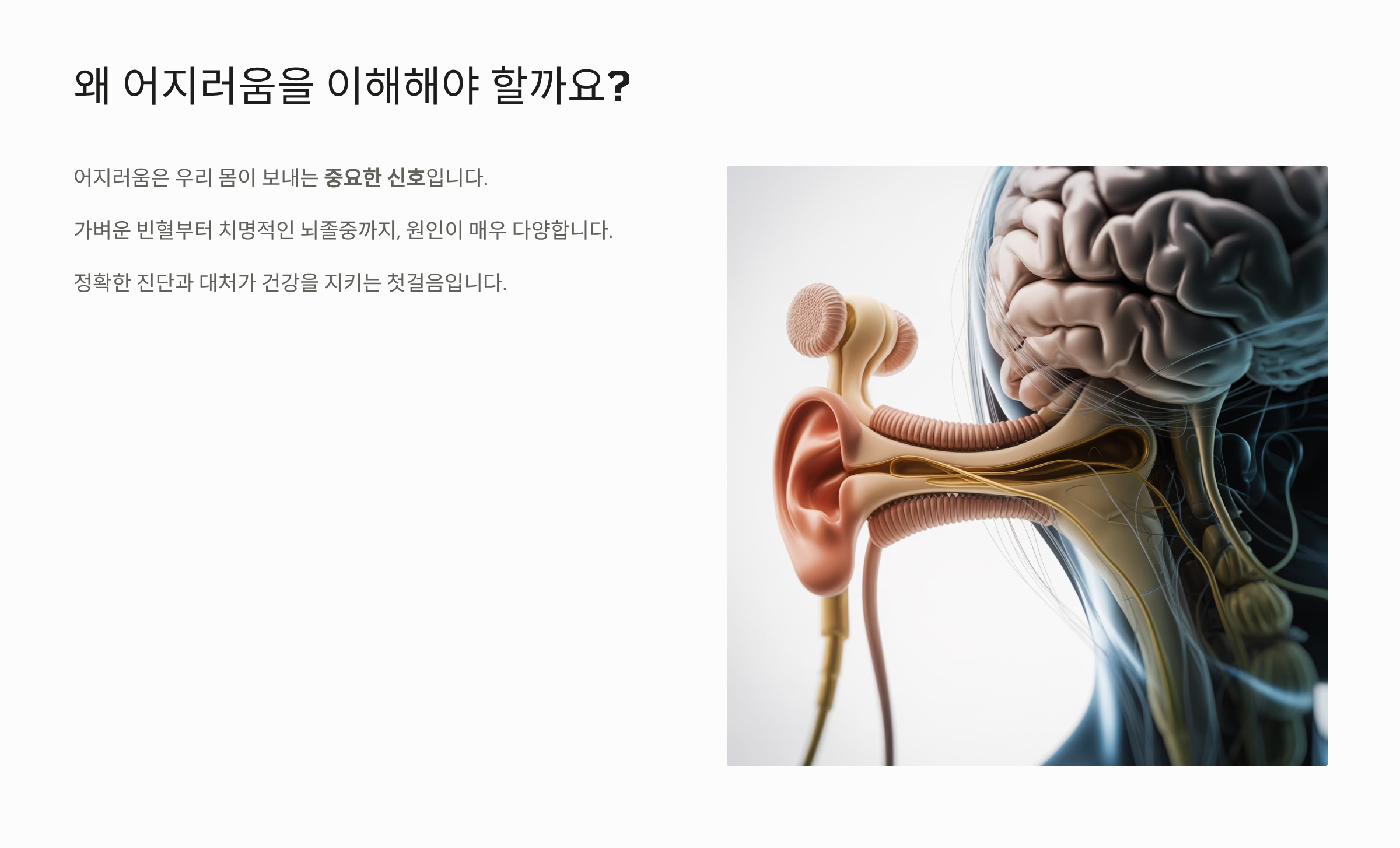 머리가 어지러운 증상은 누구나 한 번쯤 겪지만, 심한 경우 일상생활이 불가능할 정도로 불편을 줍니다. 어지러움은 우리 몸의 균형 감각 시스템(귀, 눈, 뇌, 신경계) 중 한 곳에 문제가 생겼음을 알리는 신호입니다. 이러한 어지러움이 일시적인 빈혈 때문인지, 평형 기관의 문제인지, 아니면 뇌혈관 질환 때문인지 정확히 아는 것이 올바른 대처와 치료의 첫걸음입니다.