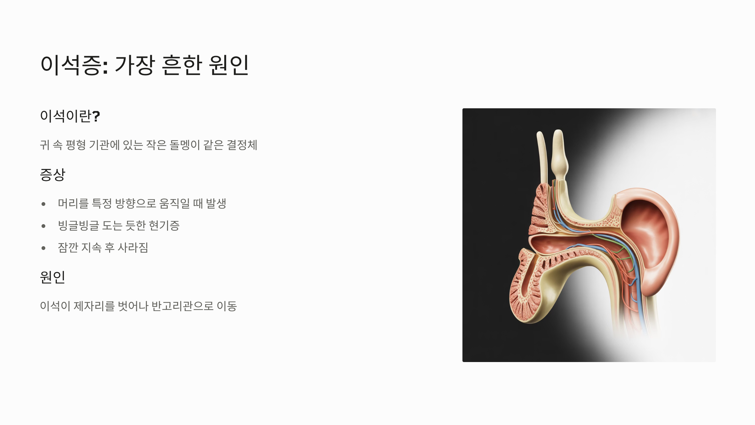 | 현기증 (Vertigo) | 주변이 빙글빙글 도는 듯한 느낌. | 말초성 (귀의 평형 기관 문제) | 이석증, 메니에르병 |
