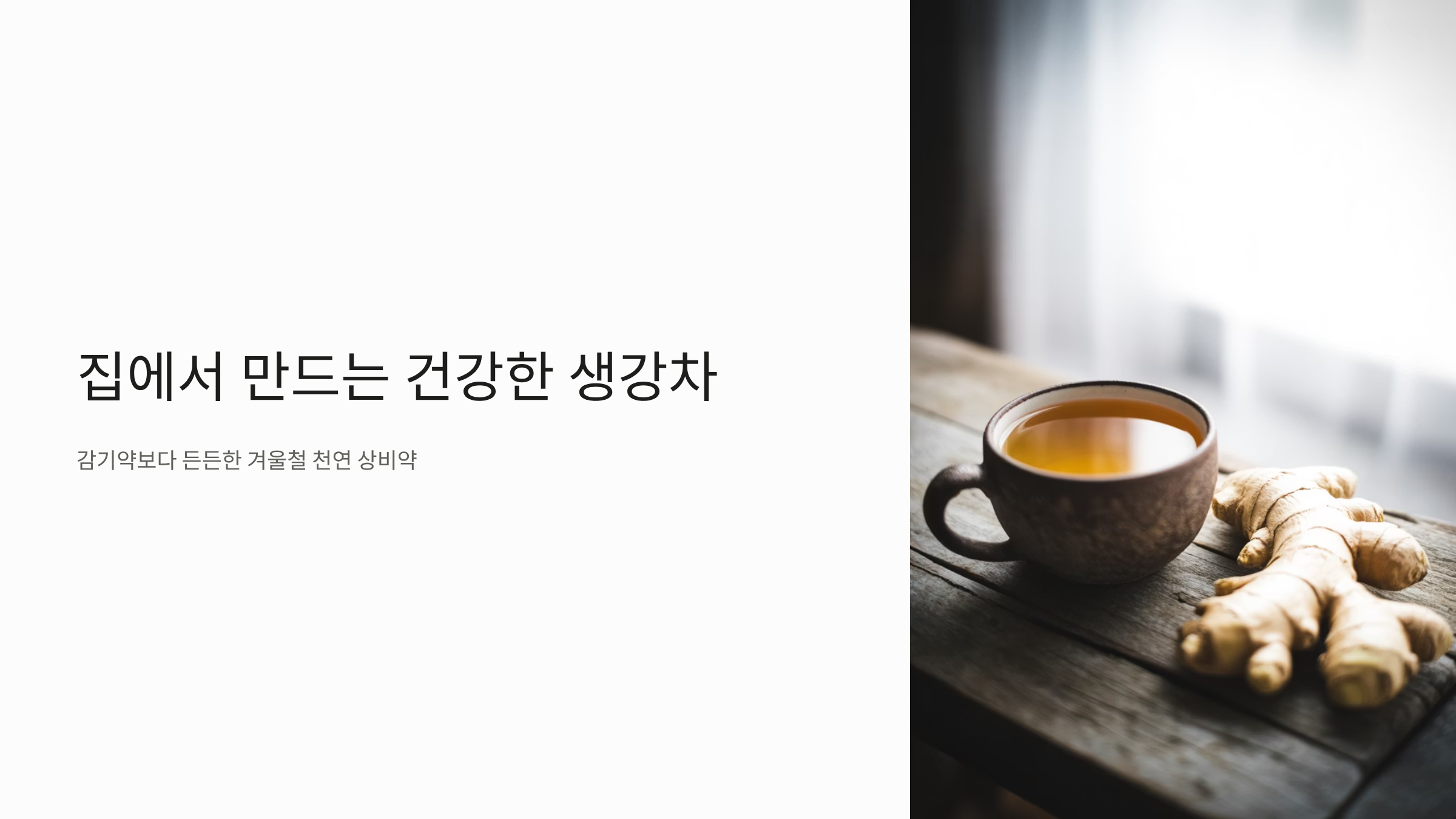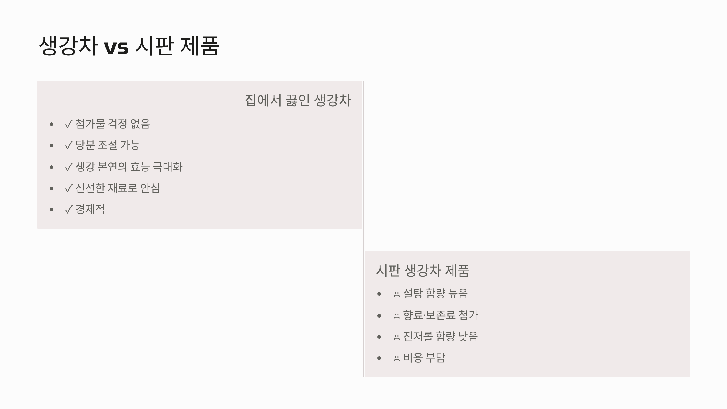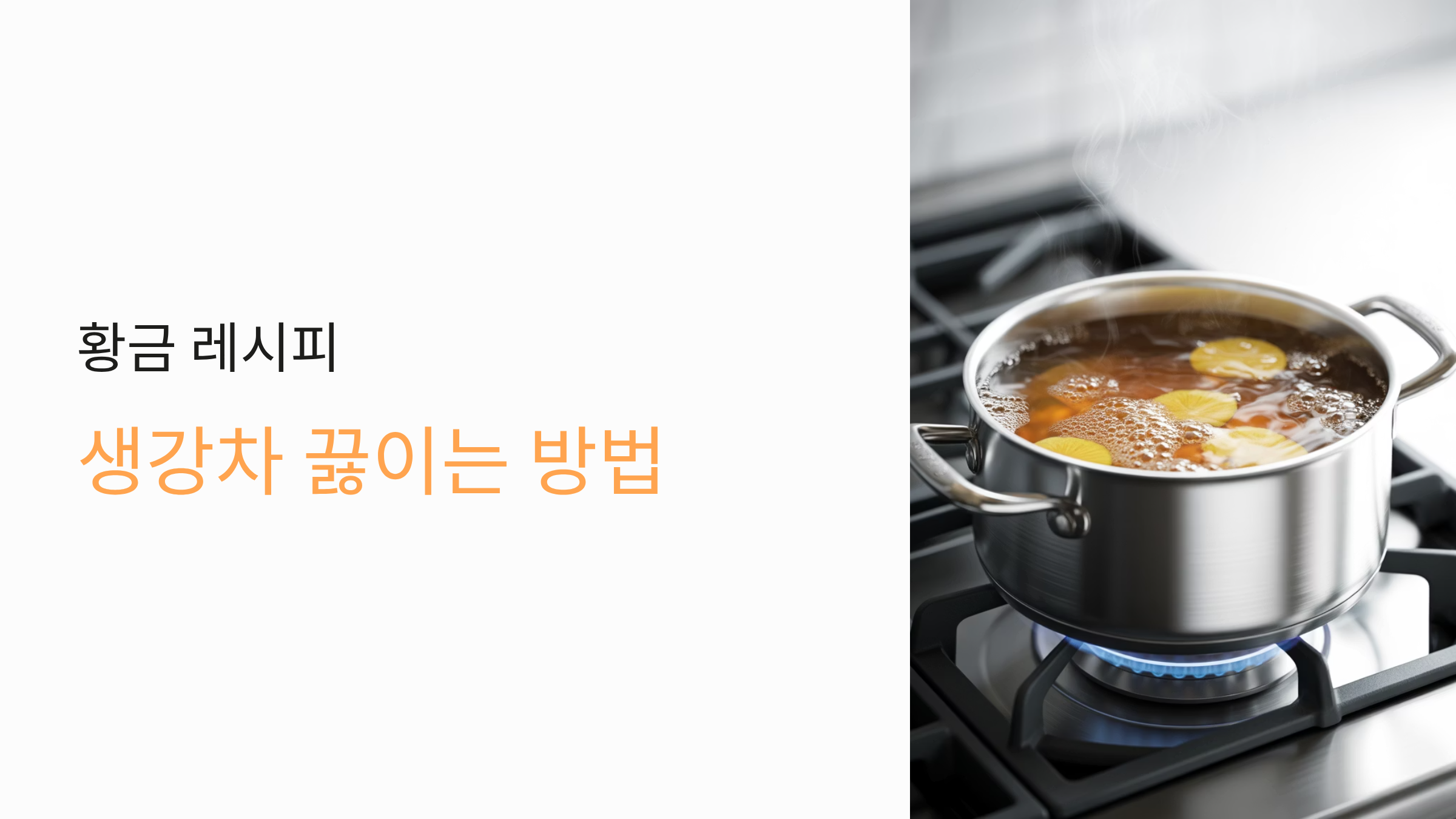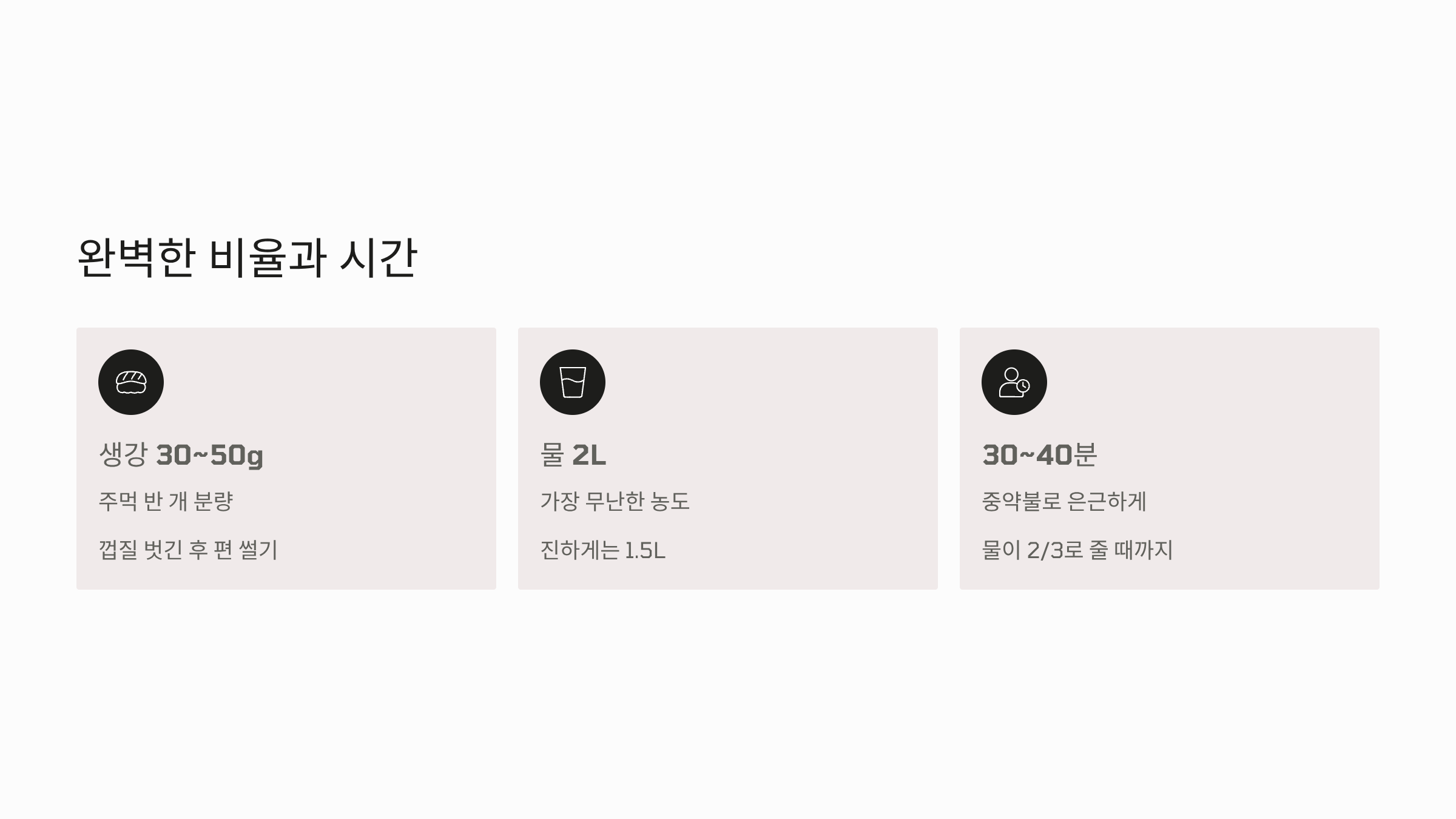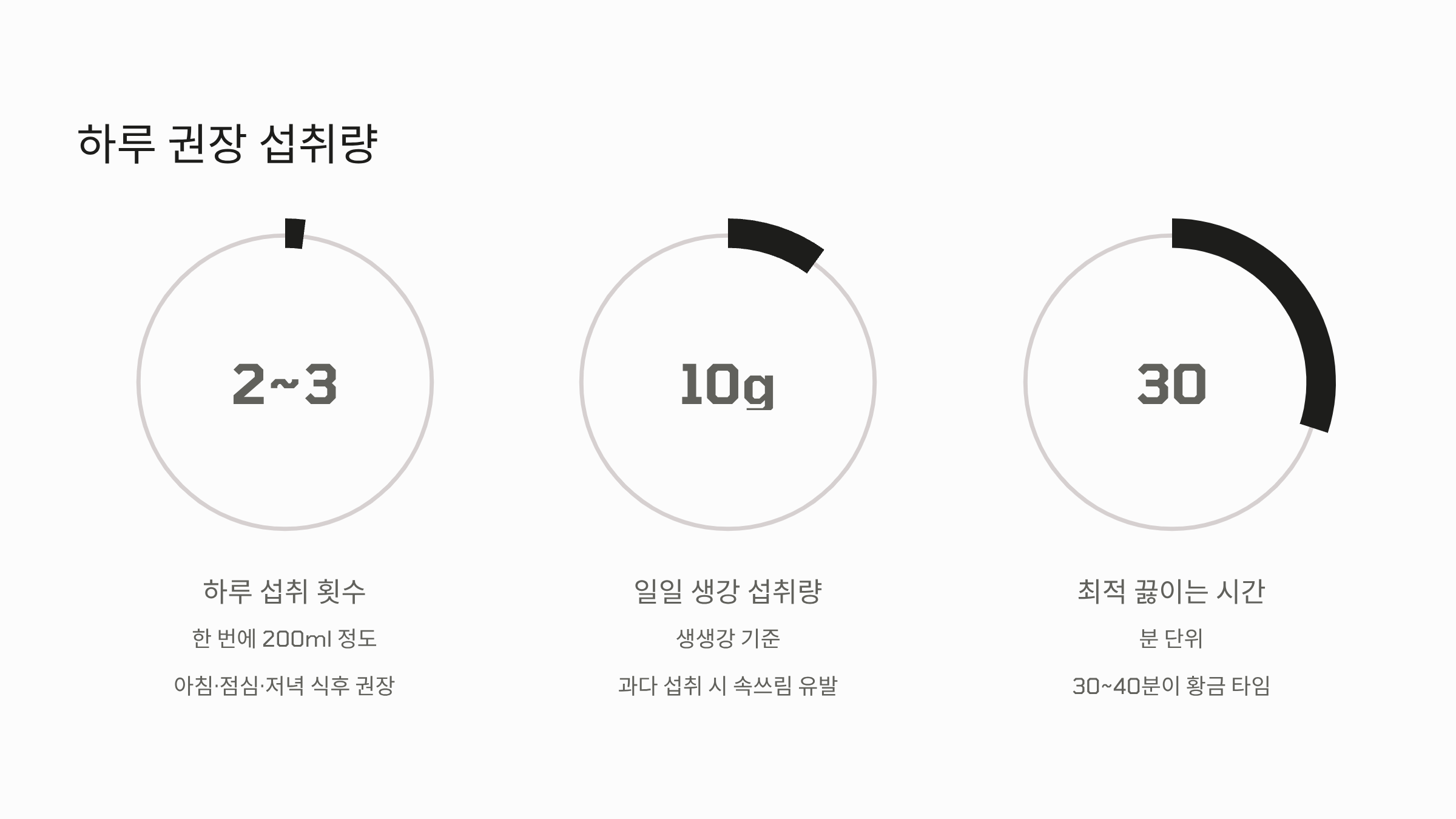 - 주의: 너무 오래(1시간 이상) 끓이면 생강 특유의 매운맛이 과해져 위장에 부담을 줄 수 있으므로 적정 시간을 지키는 것이 좋습니다.