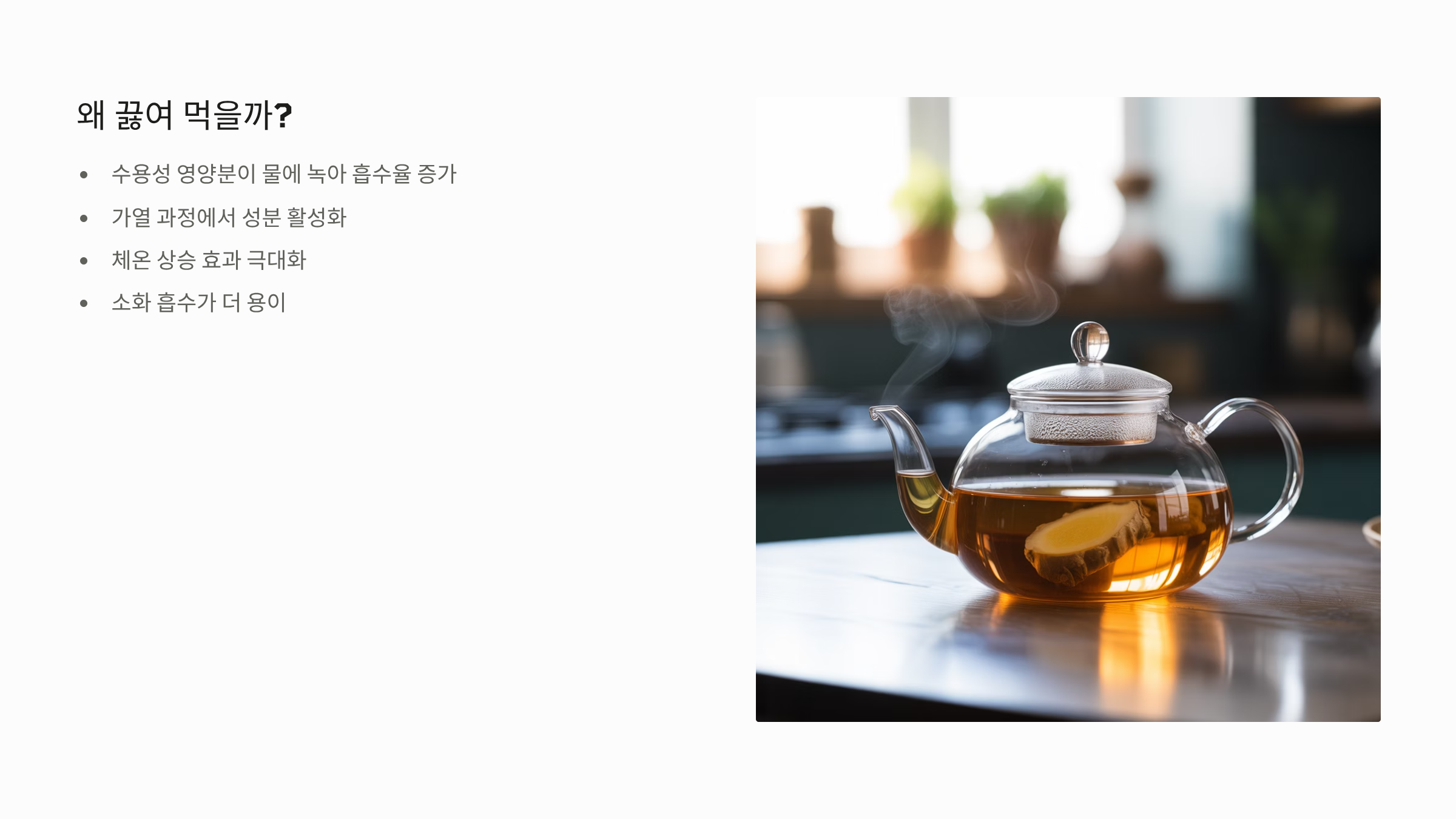 - 끓여 먹는 이유: 생강차로 끓여서 섭취하면 수용성 영양분이 물에 녹아나와 흡수율이 높아지고, 가열 과정에서 일부 성분이 활성화되어 몸을 따뜻하게 하는 데 더욱 효과적입니다.