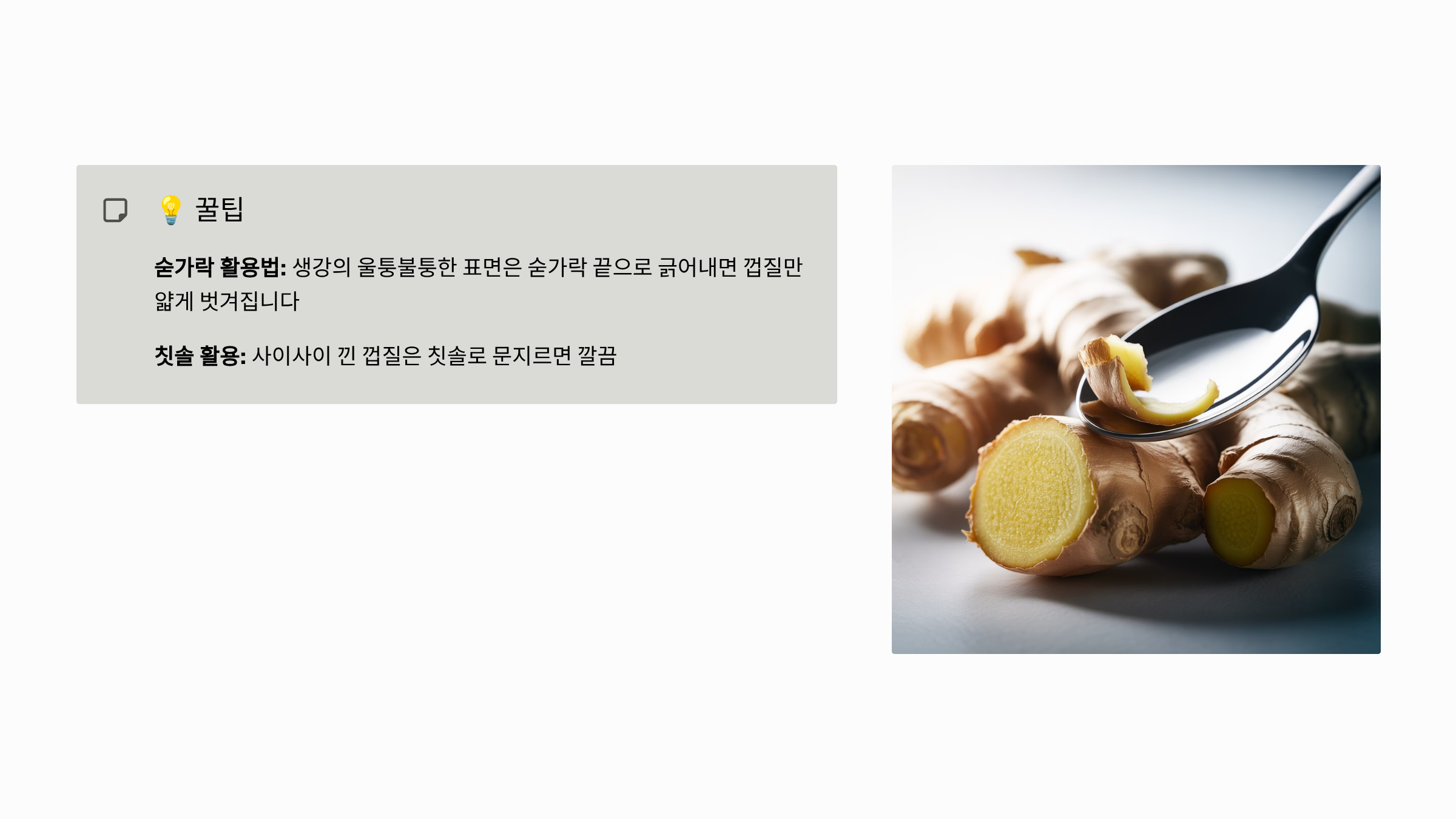 - 껍질 벗기기 (숟가락 활용): 칼을 사용하면 과육이 많이 깎여 나가고 울퉁불퉁한 표면을 손질하기 위험합니다. 대신 숟가락이나 양파망을 이용해 생강 표면을 살살 긁어내면 껍질만 얇고 깨끗하게 벗겨집니다. 사이사이 낀 껍질은 칫솔을 이용하면 편리합니다.