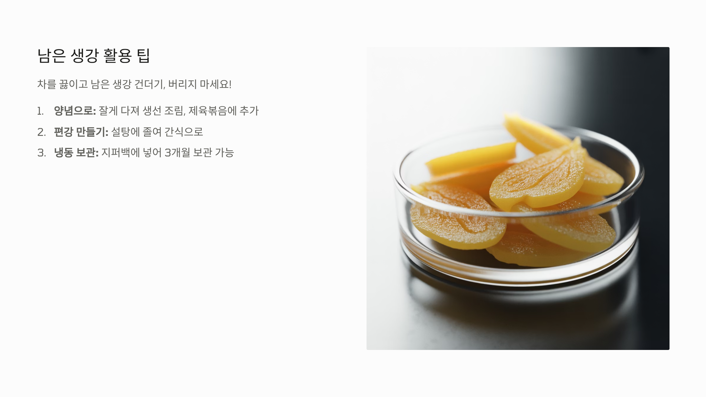 - 남은 생강 활용: 차를 끓이고 남은 생강 건더기(편)는 버리지 말고, 잘게 다지거나 믹서에 갈아 생선 조림, 제육볶음 등 요리에 맛술 대신 넣으면 비린내를 잡는 훌륭한 양념이 됩니다. 또는 설탕에 졸여 '편강'을 만들어 간식으로 즐길 수도 있습니다.