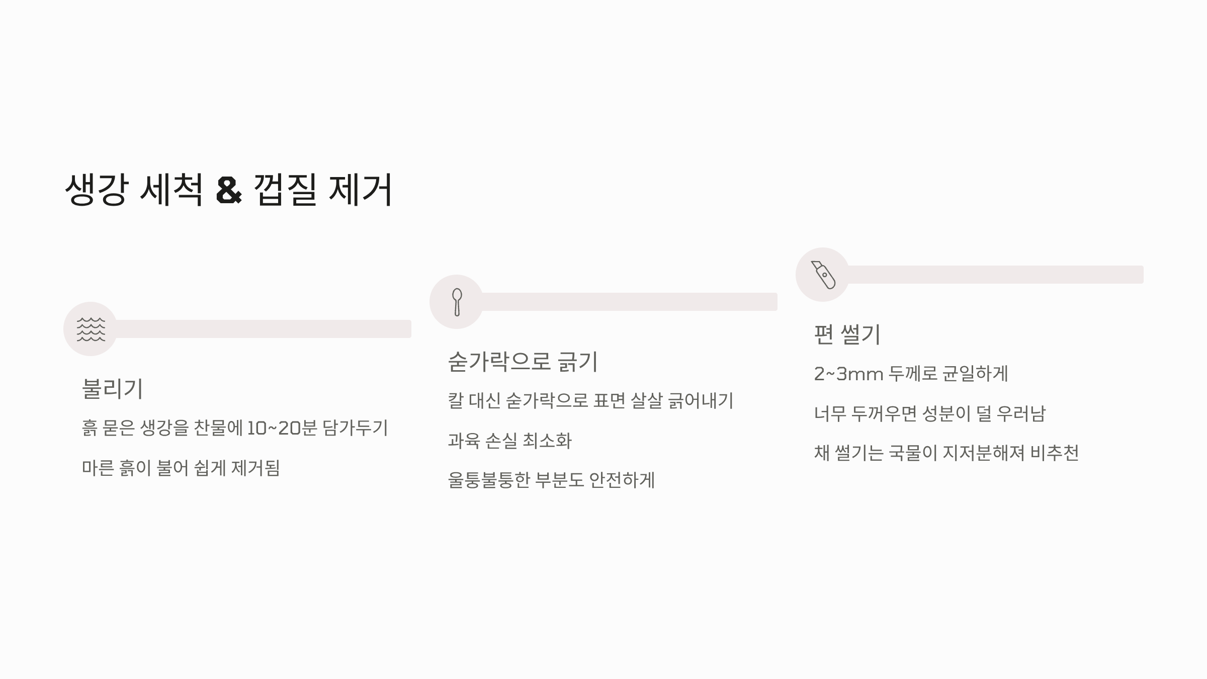 - 썰기: 껍질을 벗긴 생강은 깨끗이 헹군 후 물기를 제거하고, 2~3mm 두께로 편을 썹니다. 너무 두꺼우면 성분이 잘 우러나지 않고, 채를 썰면 국물이 지저분해질 수 있으므로 편 썰기가 가장 깔끔합니다.