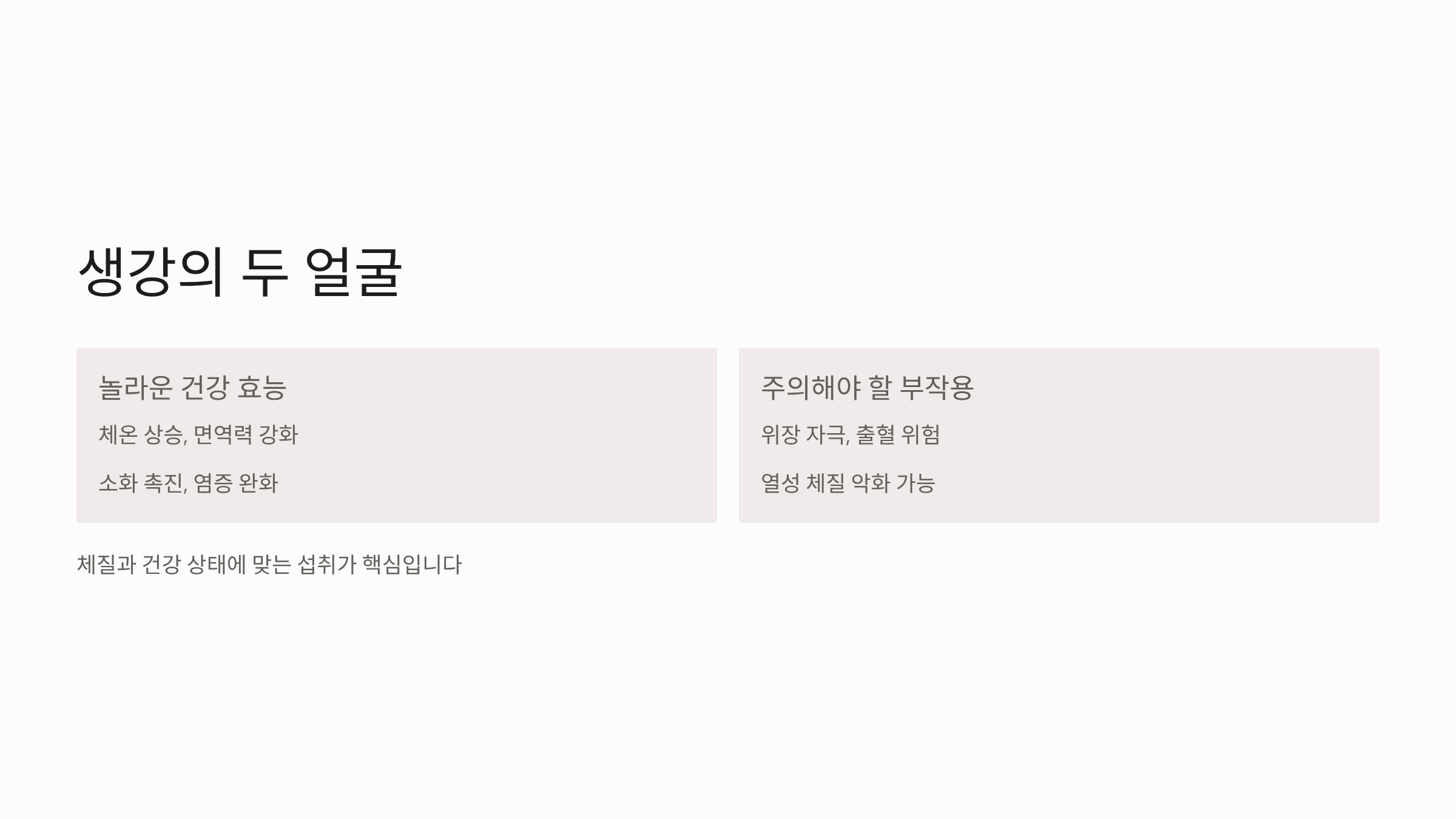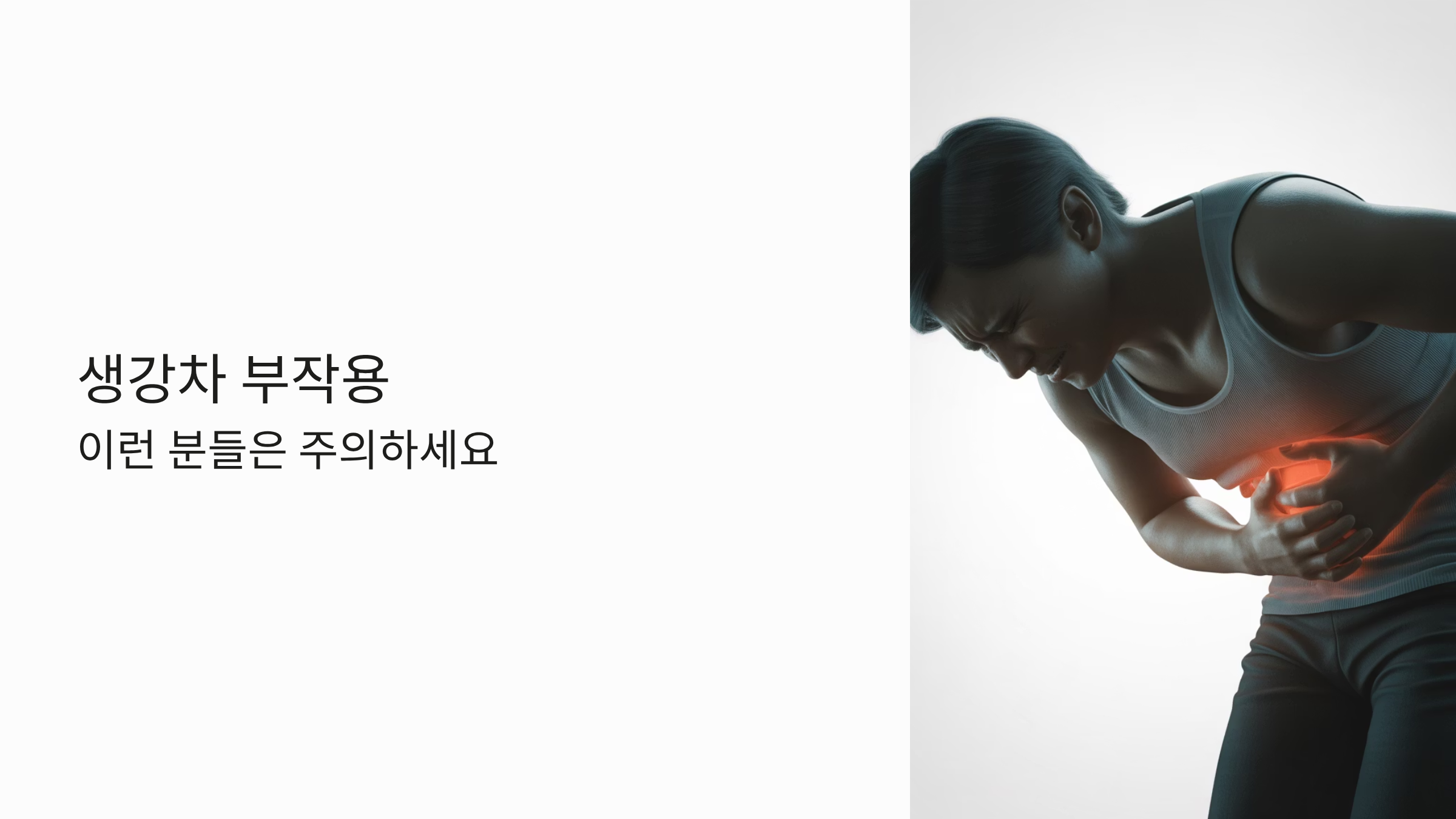 생강의 강한 성질은 양날의 검과 같습니다. 효능이 강력한 만큼 부작용 또한 명확하므로 자신의 몸 상태를 체크해야 합니다.