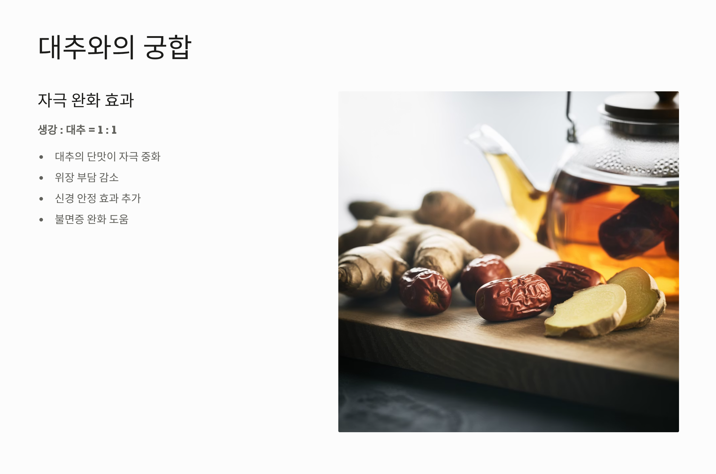 - 대추와의 블렌딩 (자극 완화): 대추의 단맛과 진정 성분은 생강의 강한 자극을 중화시켜 줍니다. 생강과 대추를 1:1 비율로 섞어 끓이면 위장에 주는 부담은 줄이면서 신경 안정과 불면증 완화 효과까지 더할 수 있습니다.