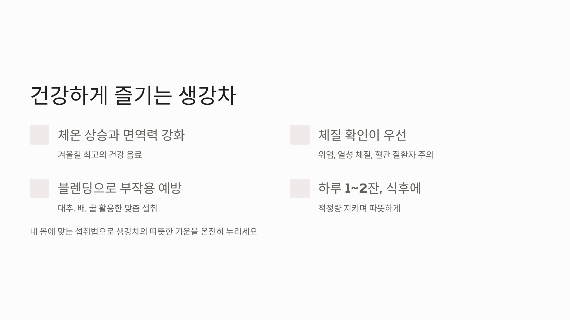 - 섭취 타이밍: 위장이 약한 분들은 절대 공복에 드시지 말고, 식사 후 따뜻하게 한 잔 정도만 섭취하는 것이 좋습니다. 하루 적정 섭취량은 성인 기준 생강 원물 5g~10g 내외, 차로는 1~2잔이 적당합니다.