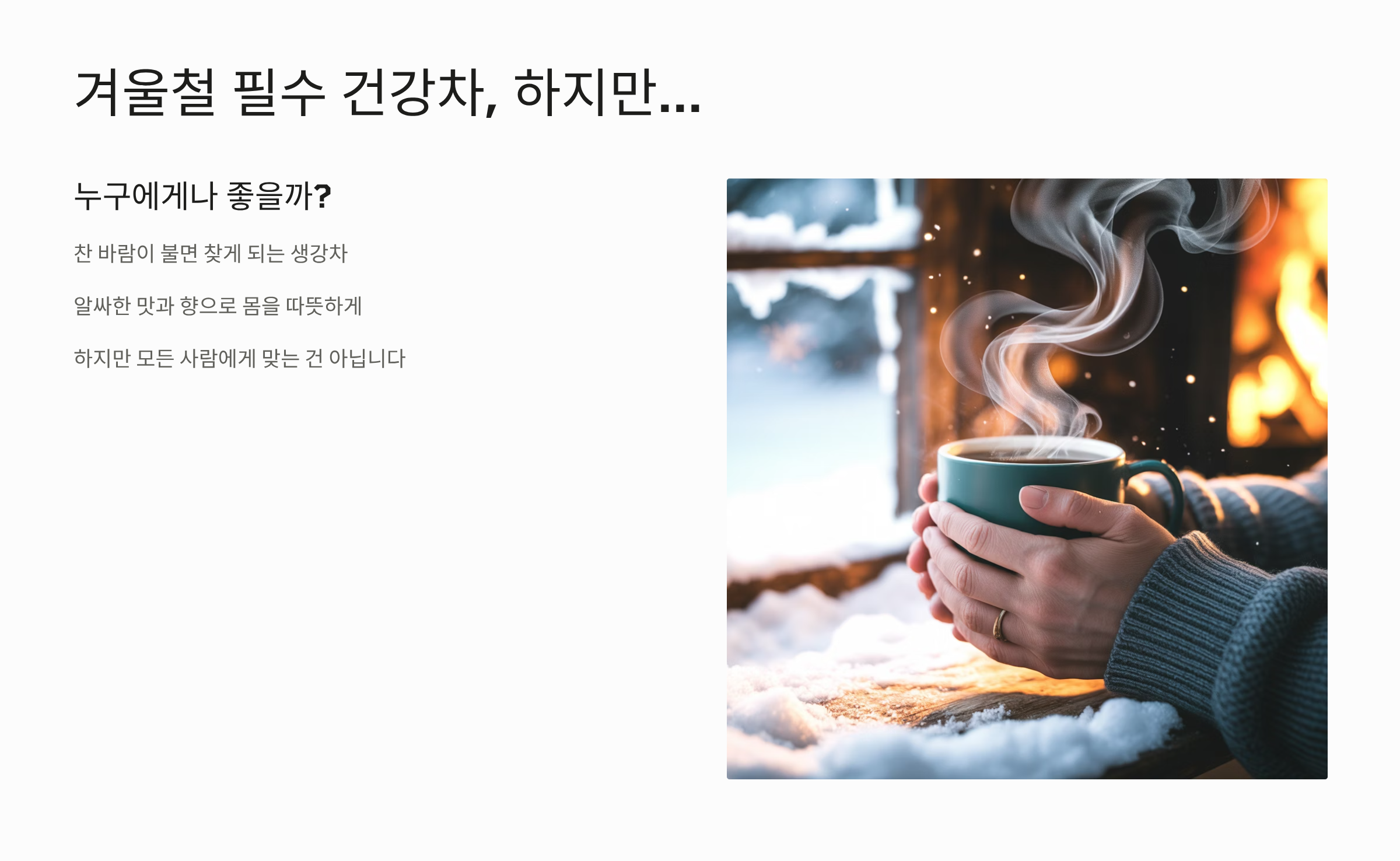 찬 바람이 불면 으레 찾게 되는 생강차는 특유의 알싸한 맛과 향으로 몸을 따뜻하게 데워주는 겨울철 필수품입니다. '공자가 식사 때마다 챙겨 먹었다'는 기록이 있을 정도로 예로부터 그 효능을 인정받아 왔지만, 모든 사람에게 무조건 좋은 것은 아닙니다. 생강의 강한 약성은 누군가에게는 활력을 주지만, 누군가에게는 위장을 깎아내리는 고통을 줄 수도 있기 때문입니다.