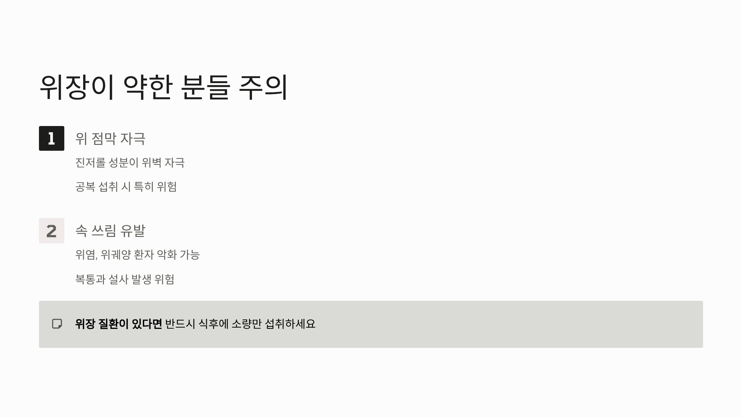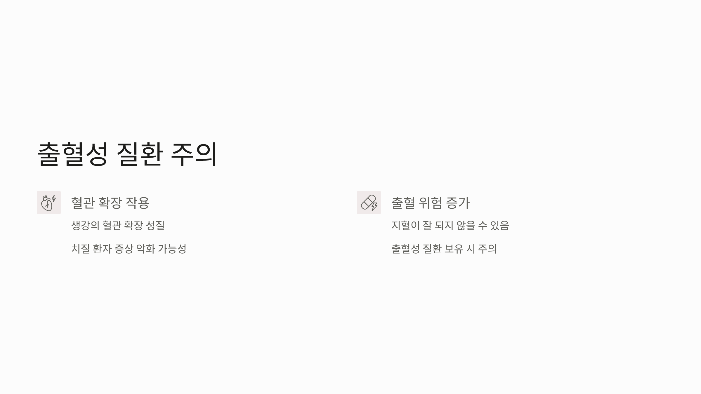 - 치질 환자 주의: 혈관을 확장시키는 성질 때문에 치질 등 출혈성 질환이 있는 경우 증상이 악화될 가능성이 있습니다.