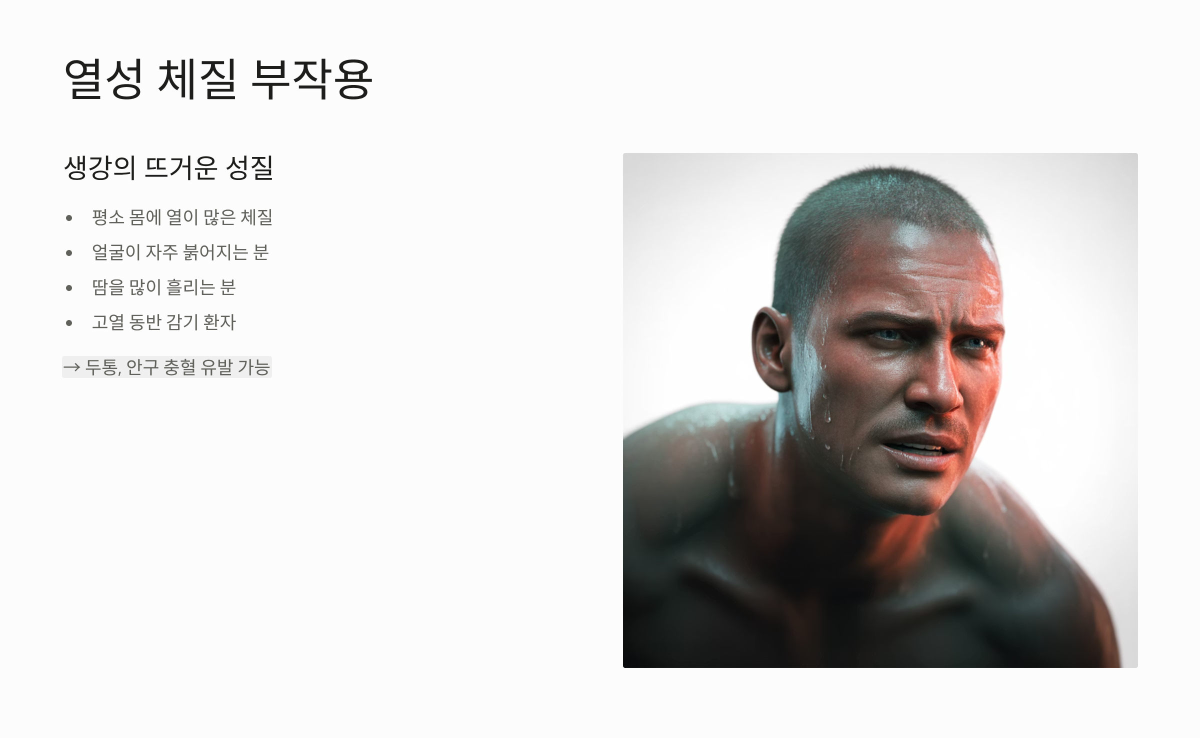 - 열성 체질의 부작용: 한의학적으로 생강은 뜨거운 성질을 가집니다. 평소 몸에 열이 많아 얼굴이 자주 붉어지거나 땀을 많이 흘리는 체질, 혹은 고열이 동반된 감기 환자가 섭취할 경우 열을 더 부추겨 두통이나 안구 충혈 등을 유발할 수 있습니다.