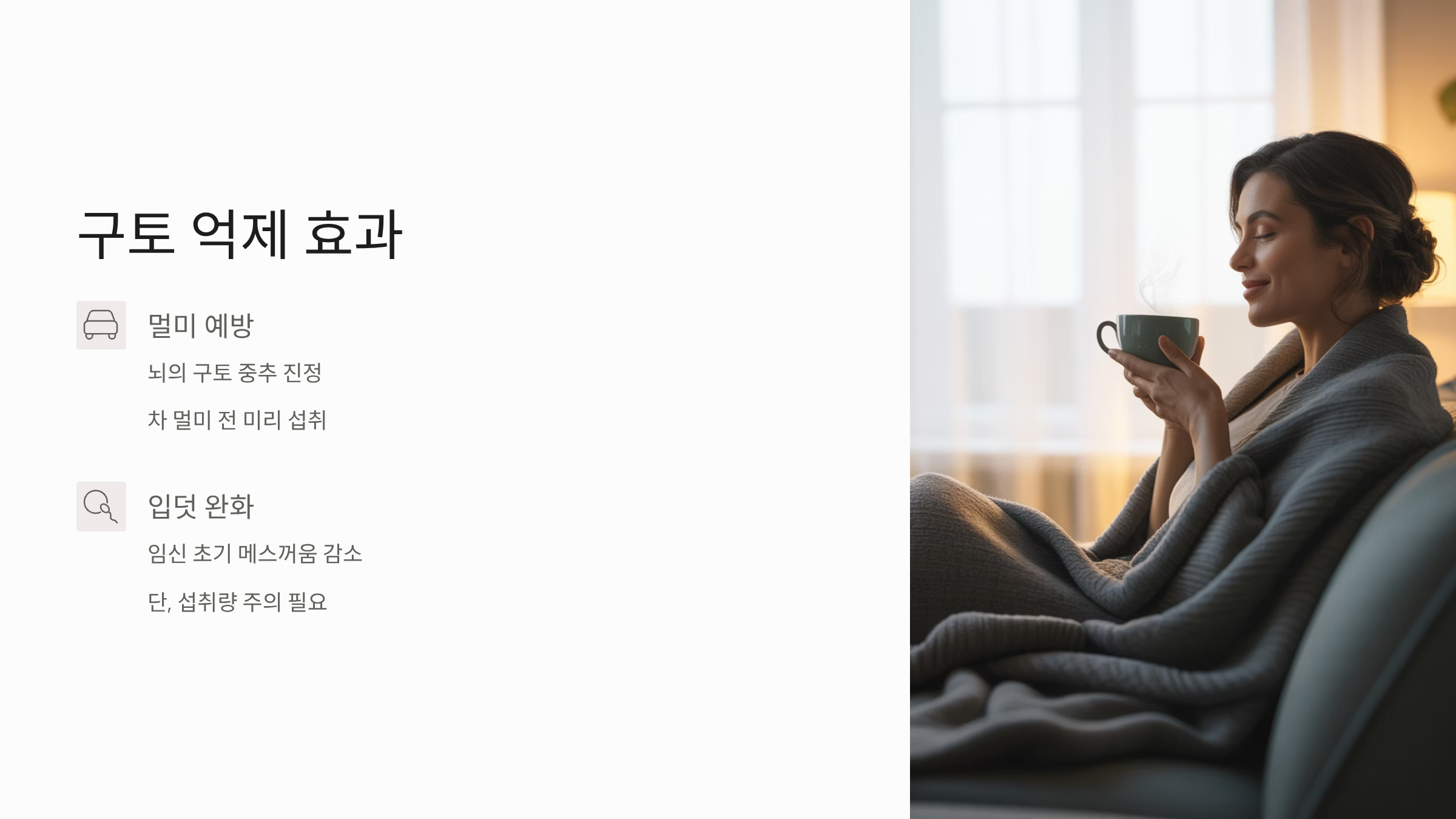 - 구토 억제 (멀미, 입덧): 생강은 뇌의 구토 중추를 진정시키는 효과가 있어 '천연 멀미약'이라 불립니다. 차 멀미가 심할 때 미리 마시거나, 임신 초기의 심한 입덧을 진정시키는 데에도 효과적입니다. (단, 임산부는 섭취량에 주의가 필요합니다.)