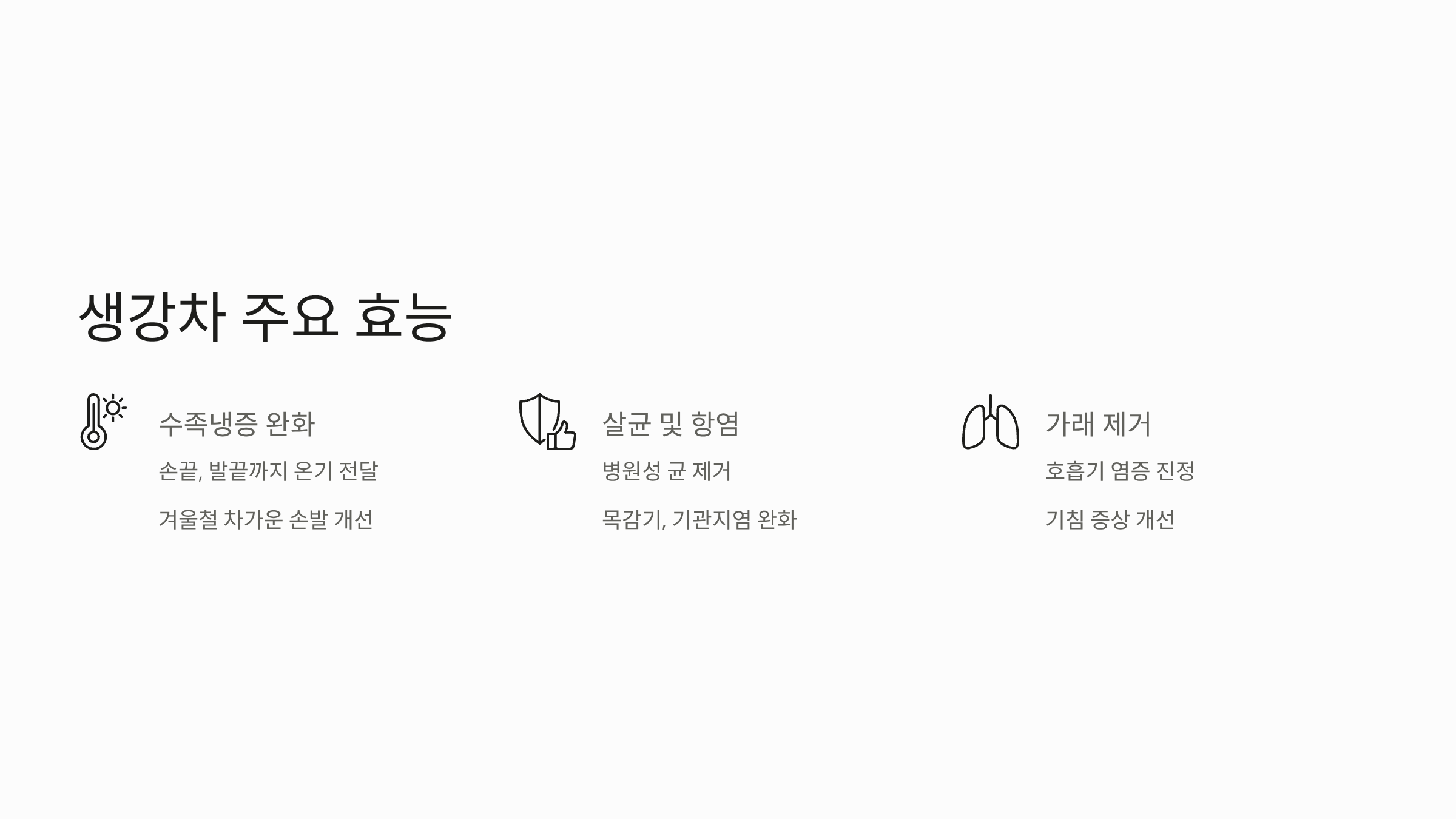 - 수족냉증 완화: 겨울만 되면 손발이 차가워 고생하는 수족냉증 환자들에게 생강차는 혈류량을 늘려 손끝, 발끝까지 온기를 전하는 천연 난로 역할을 합니다.