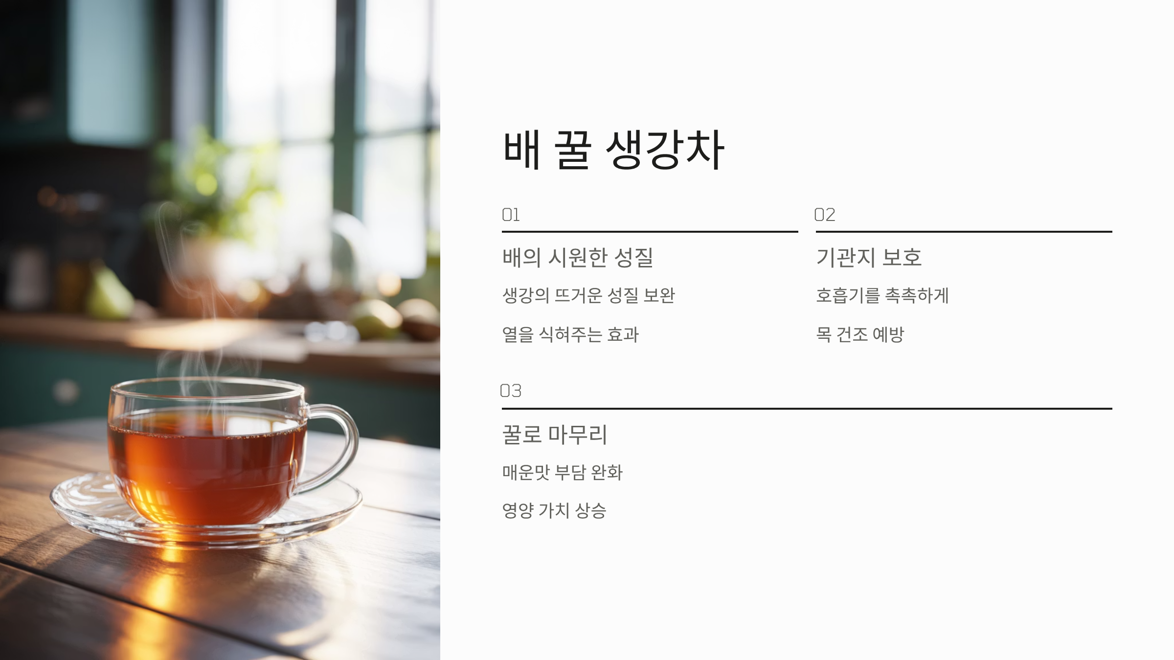- 배 꿀 생강차 (호흡기 보호): 배는 열을 식히고 기관지를 촉촉하게 하는 성질이 있어 생강의 뜨거운 성질을 보완합니다. 생강의 매운맛이 부담스럽다면 배를 갈아 넣거나 꿀을 넉넉히 넣어 드시는 것이 좋습니다.