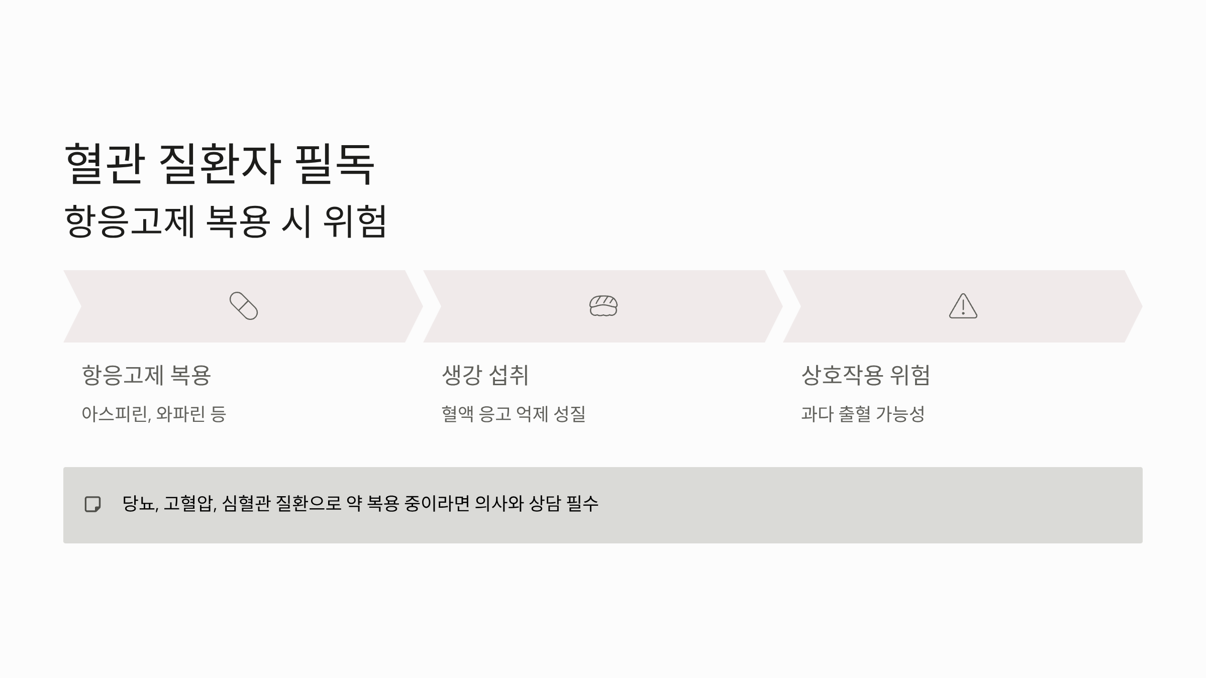 - 항응고제와의 상호작용: 당뇨나 고혈압, 심혈관 질환으로 인해 아스피린, 와파린 등 혈액 응고 억제제(항응고제)를 복용 중인 경우 주의해야 합니다. 생강 역시 혈액을 묽게 하고 응고를 늦추는 성질이 있어, 약물과 함께 과다 섭취할 경우 지혈이 잘되지 않거나 출혈 위험을 높일 수 있습니다.