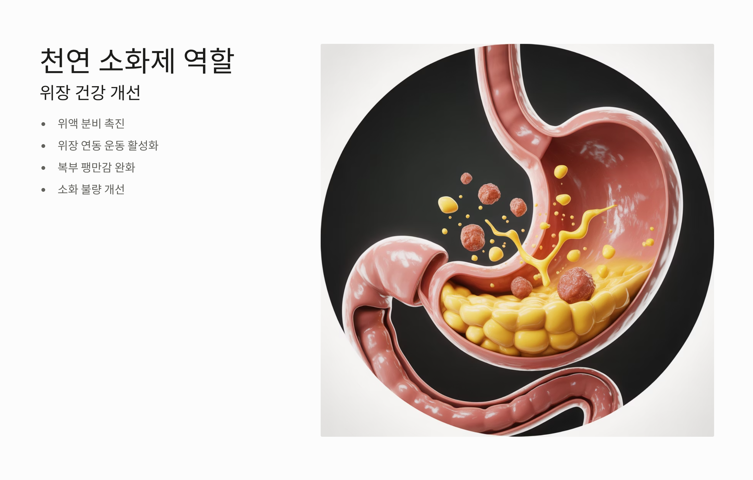 - 위장 운동 촉진: 생강은 위 점막을 적절히 자극하여 위액 분비를 늘리고 위장의 연동 운동을 활발하게 만듭니다. 이는 음식물의 소화를 돕고 가스가 차는 복부 팽만감을 완화해 줍니다.