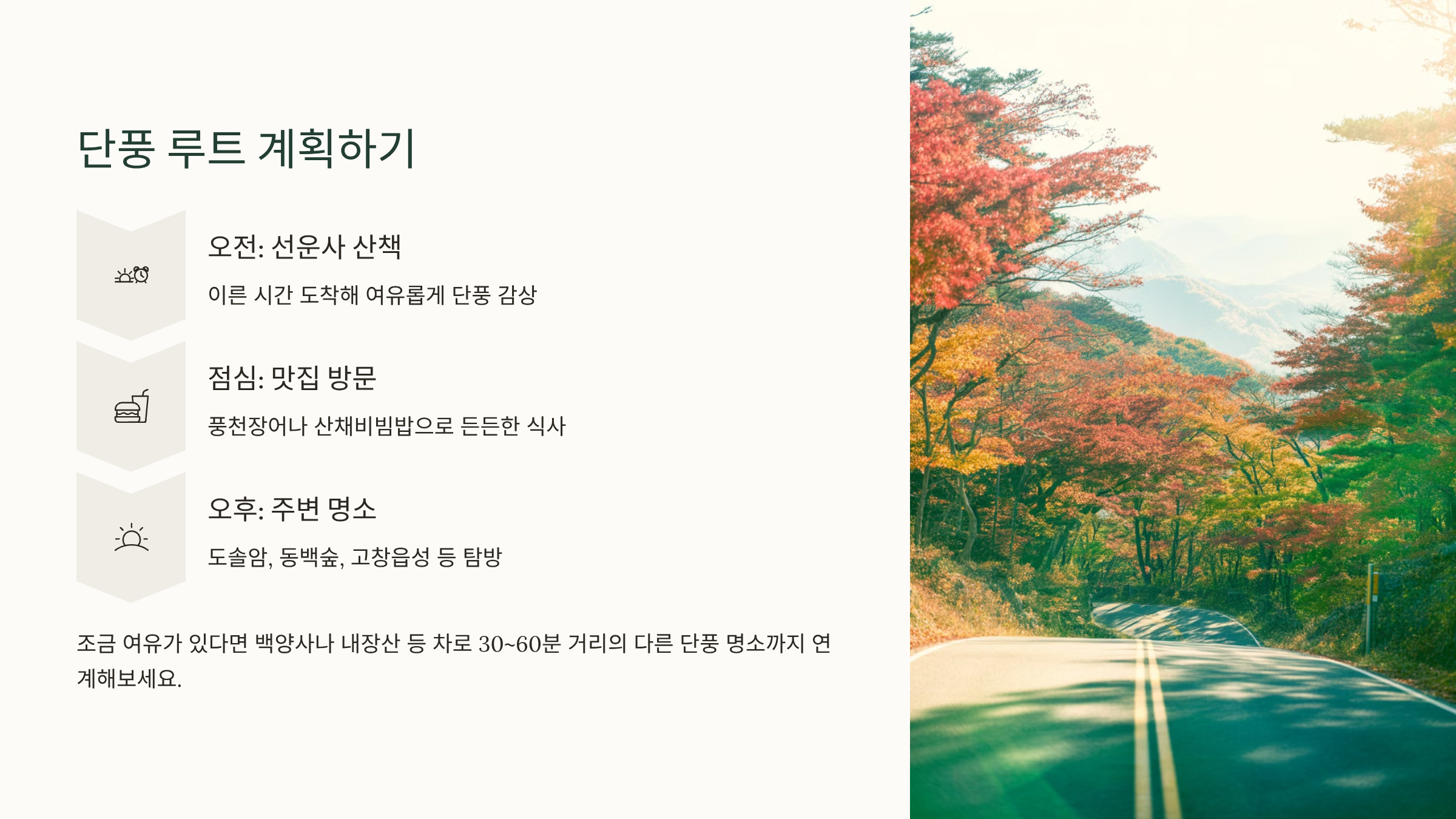 - 백양사·내장산 등 인근 산지 단풍명소: 조금 여유가 있다면 차로 약 30~60분 거리의 다른 단풍 명소까지 연계해 ‘단풍 루트’로 계획해보는 것도 좋습니다.