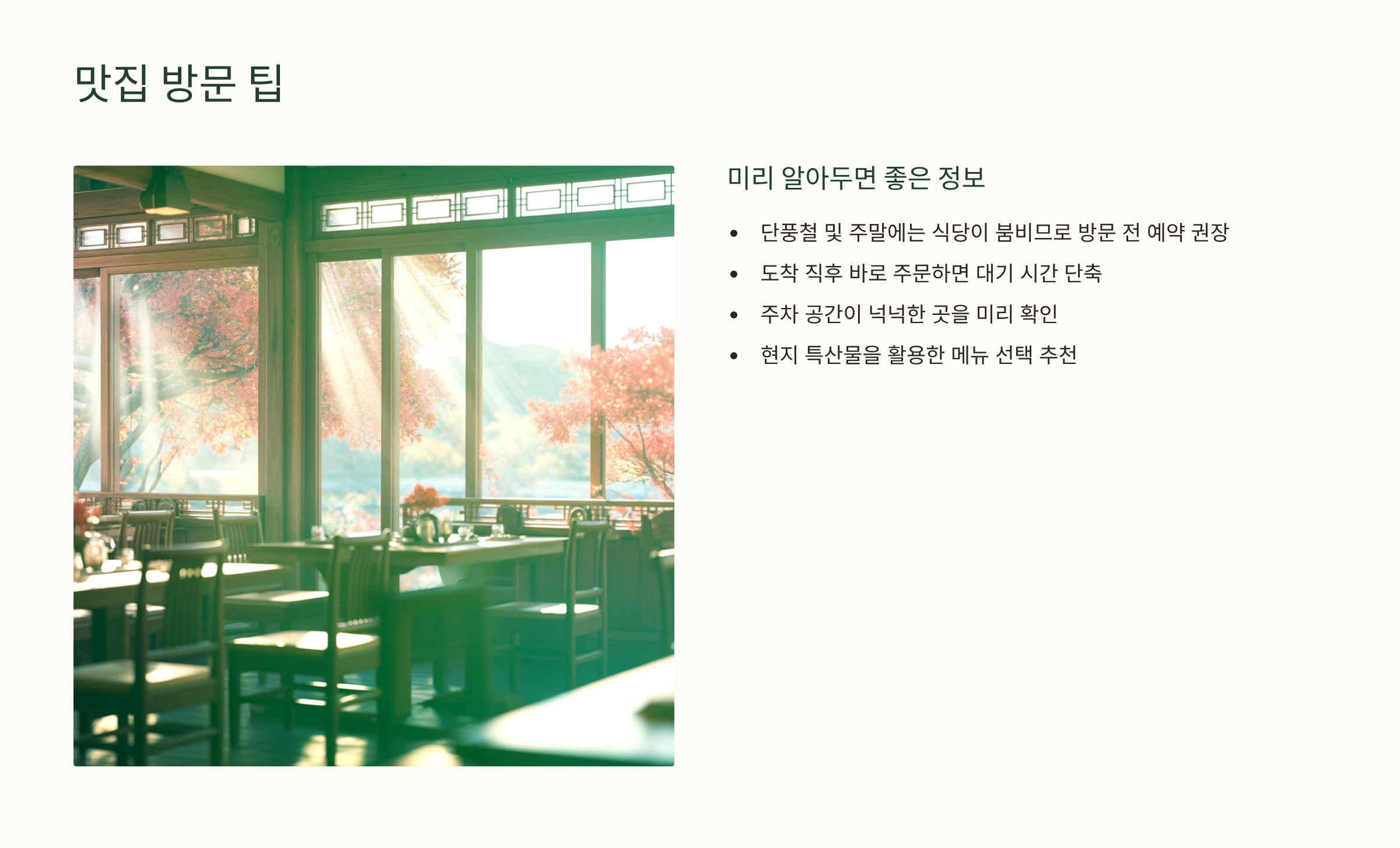 맛집 선택 시 참고사항: 단풍철 및 주말에는 식당이 붐비는 경우가 많으므로, 방문 전 예약 또는 도착 직후 주문 추천됩니다. 주차 공간이 넉넉한 곳을 미리 확인하는 것도 좋습니다.