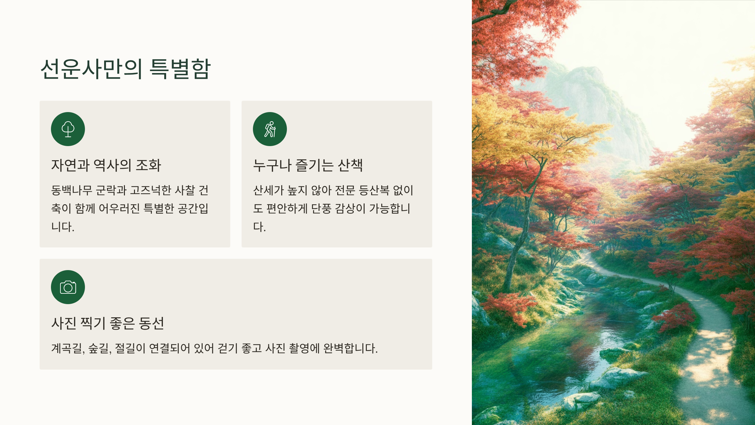 - 계곡길, 숲길, 절길이 연결되어 있어 걷기 좋고 사진 찍기 좋은 동선이 확보되어 있습니다.