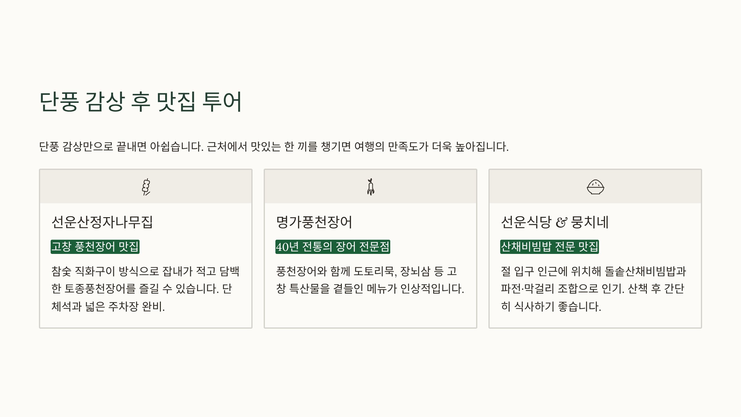 단풍 감상만으로 끝내면 아쉬우니까, 근처에서 ‘맛있는 한 끼’까지 챙기면 여행의 만족도가 더 높아집니다. 선운사 인근에서 추천할 만한 맛집은 다음과 같습니다.