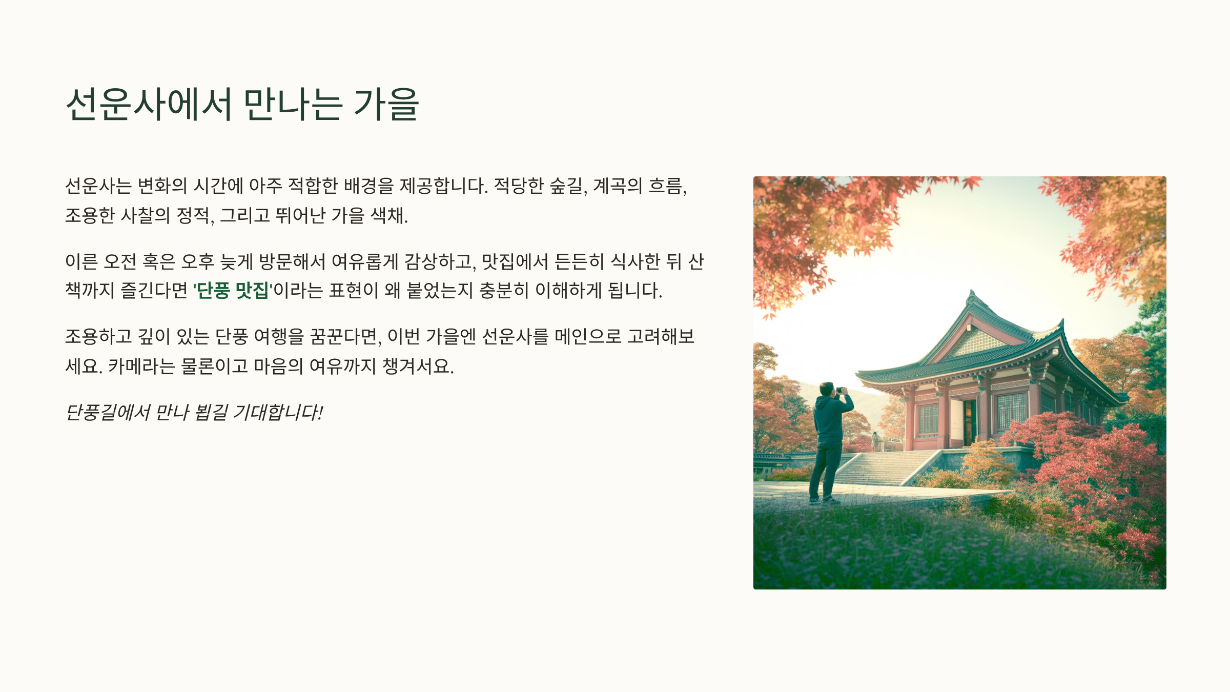 가을 단풍 여행은 단순히 ‘나무색이 바뀌었다’는 풍경을 넘어서, 시간과 계절이 만들어낸 자연의 변화, 마음의 여유를 담아가는 경험입니다. 선운사는 그 변화의 시간에 아주 적합한 배경을 제공합니다: 적당한 숲길, 계곡의 흐름, 조용한 사찰의 정적, 그리고 뛰어난 가을 색채.