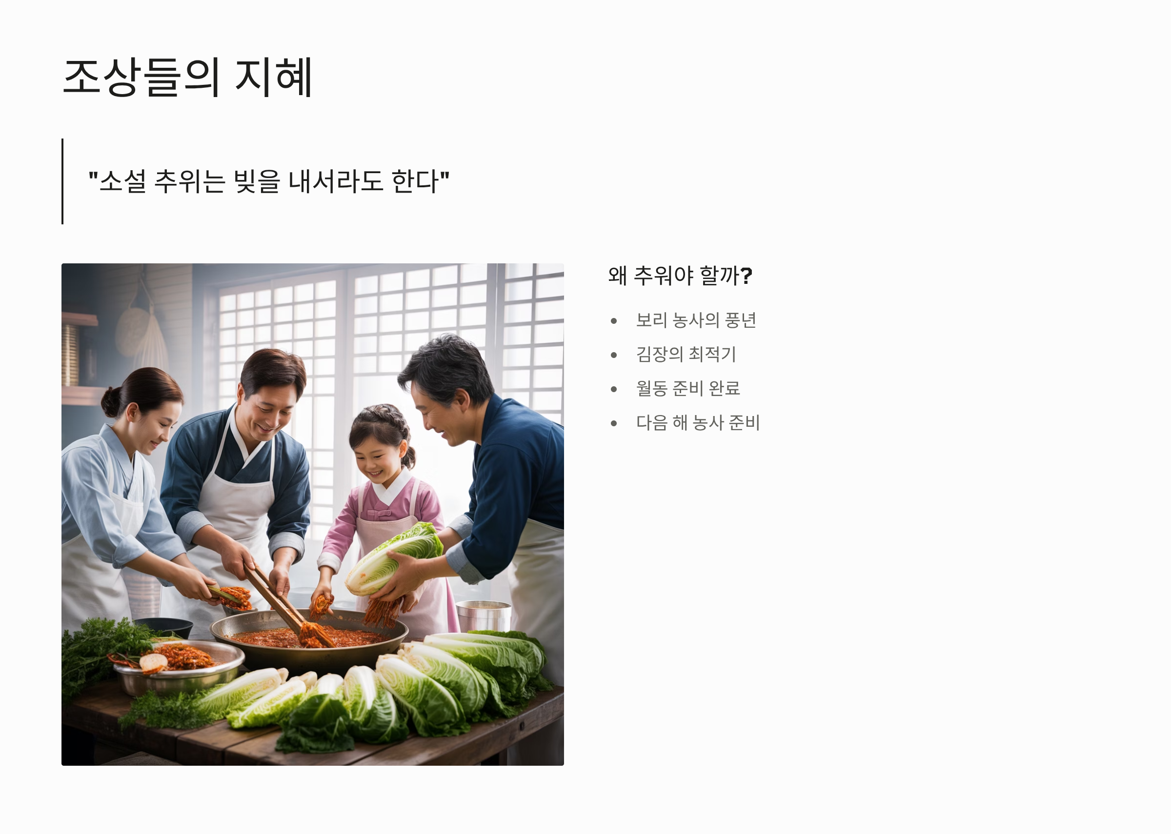 우리 조상들은 소설 추위는 빚을 내서라도 한다는 속담을 남겼습니다. 날씨가 추워야 보리 농사가 잘 된다고 믿었기 때문이며, 이 시기에 김장을 서두르고 월동 준비를 마치는 등 바쁜 시기를 보냈습니다. 소설은 단순한 추위의 시작이 아니라, 한 해를 마무리하고 다음 해의 농사를 준비하는 중요한 분기점이었습니다.