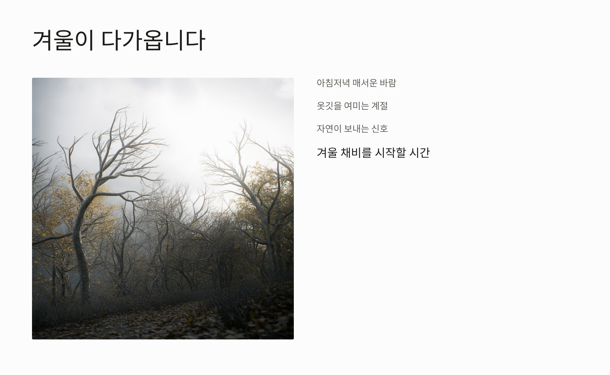 아침저녁으로 불어오는 바람이 제법 매서워지고, 옷깃을 여미게 되는 요즘입니다. 가을의 풍요로움이 지나가고 어느덧 겨울의 문턱에 들어섰음을 실감하게 되는데, 바로 이 시기에 찾아오는 절기가 소설(小雪)입니다.