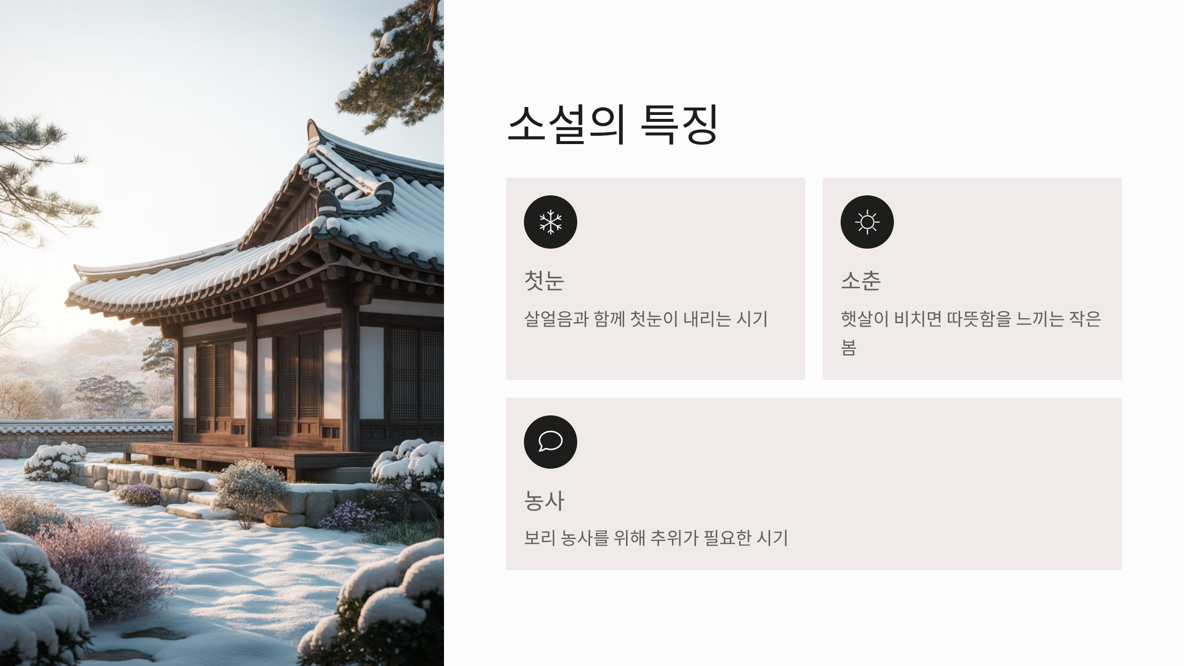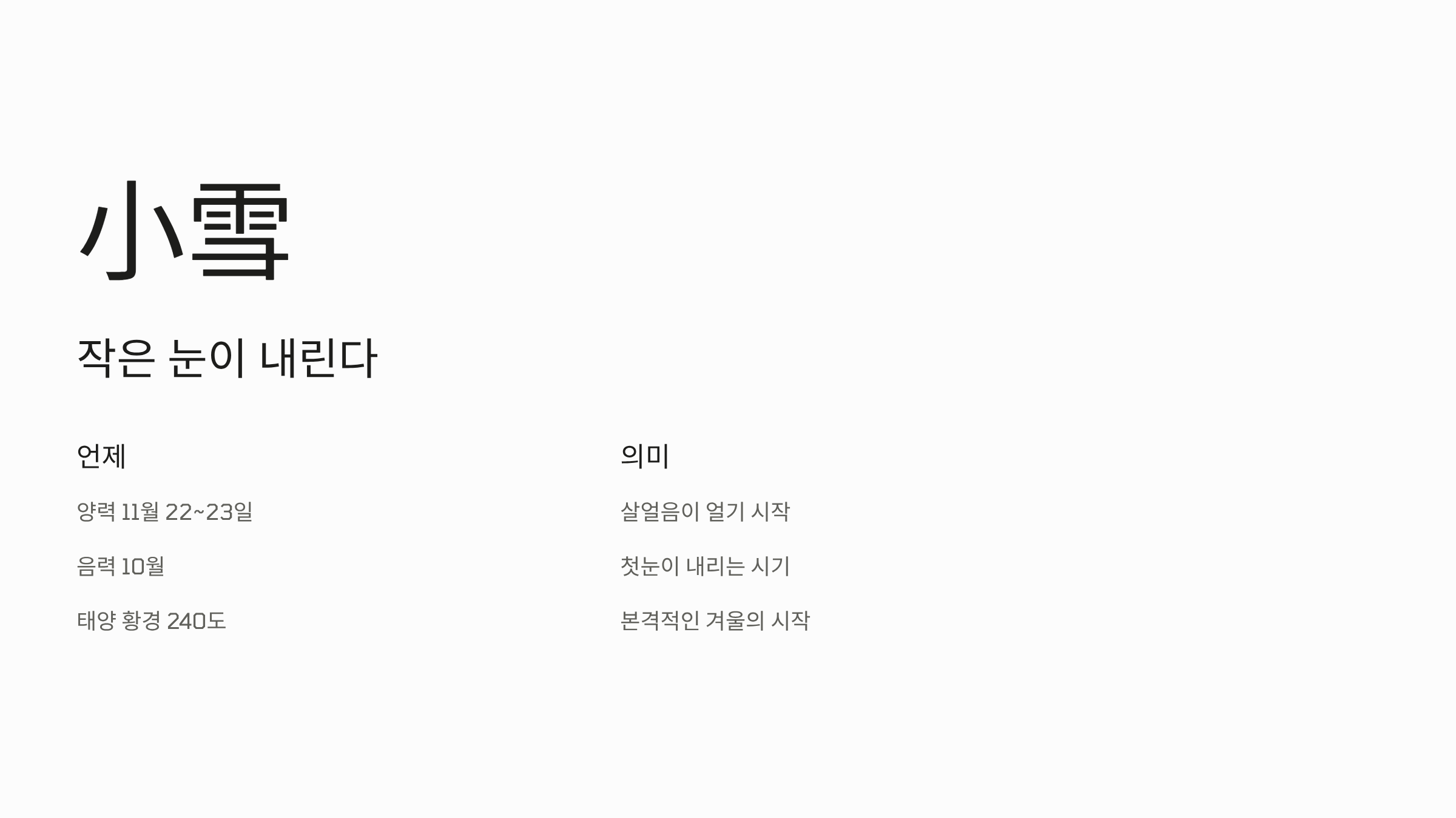 2. 절기 소설 뜻: 첫눈이 내리고 본격적인 겨울이 시작되는 시점