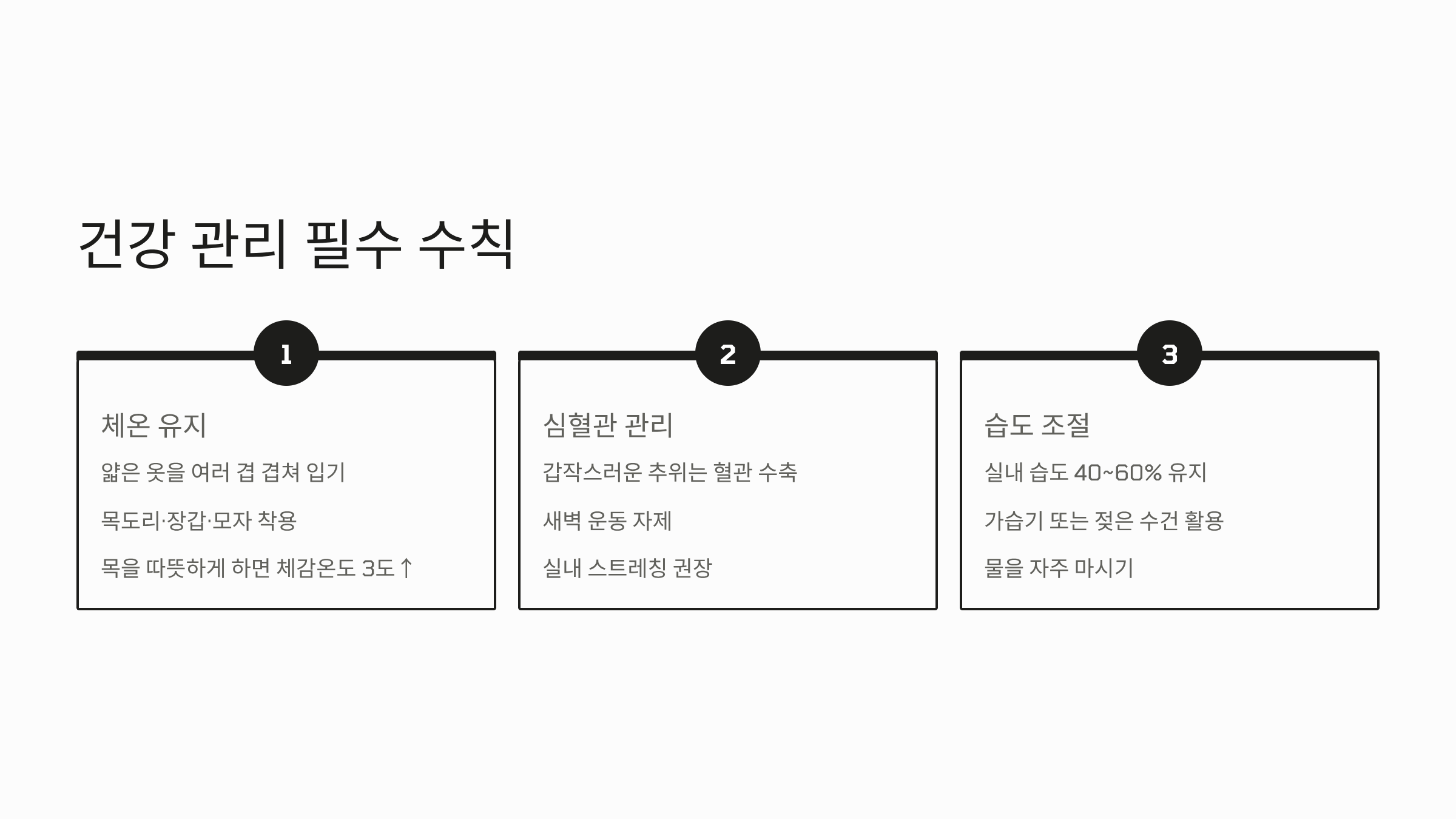 두 번째는 심혈관 질환 예방입니다. 갑작스러운 추위는 혈관을 수축시켜 혈압을 높일 수 있습니다. 고혈압이나 심장 질환이 있는 분들은 새벽 운동이나 찬 바람을 직접 맞는 야외 활동을 자제하고, 실내에서 가벼운 스트레칭을 하는 것이 좋습니다.