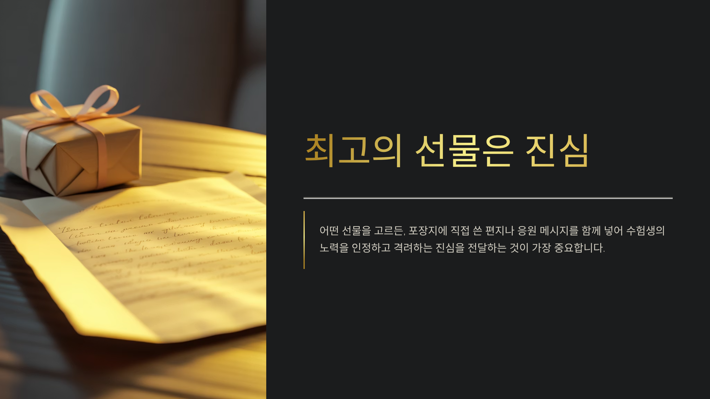 최고의 선물은 진심: 어떤 선물을 고르든, 포장지에 직접 쓴 편지나 응원 메시지를 함께 넣어 수험생의 노력을 인정하고 격려하는 진심을 전달하는 것이 가장 중요합니다.