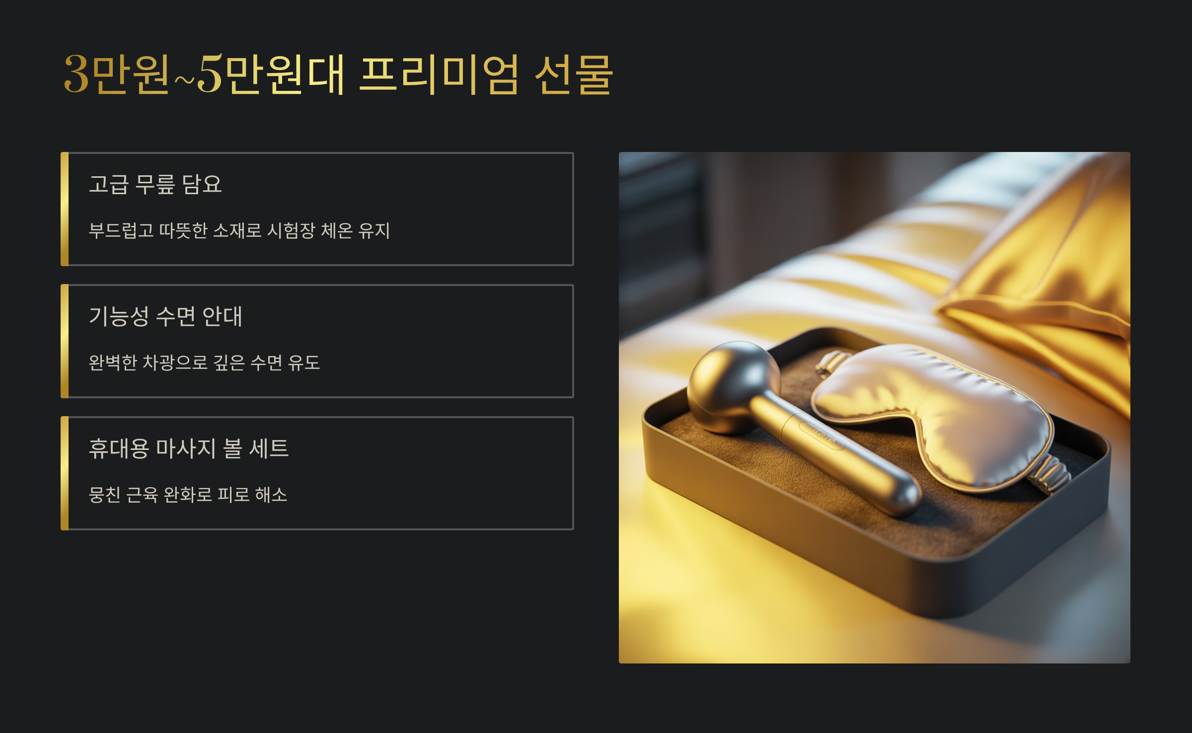 | 3만원 ~ 5만원 | 고급 무릎 담요, 기능성 수면 안대, 휴대용 마사지 볼 세트, EBS 연계 교재 상품권 | 긴장 완화와 휴식을 돕는 물품으로, 수험생의 피로 해소에 초점을 맞춥니다. |