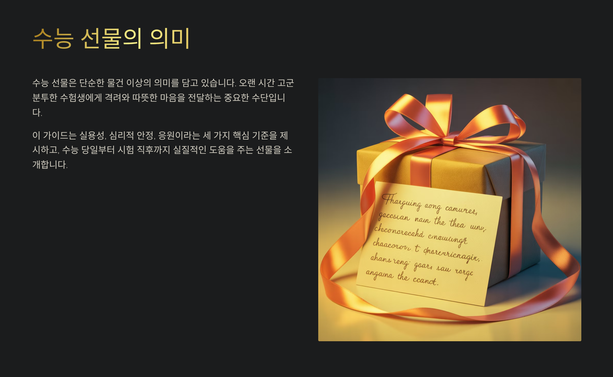 이 글은 수능 선물을 고를 때 필요한 세 가지 핵심 기준(실용성, 심리적 안정, 응원)을 제시하고, 수능 당일 집중력과 컨디션을 유지하는 데 실질적인 도움을 주는 필수 실용 선물 목록을 소개합니다. 또한, 시험의 중압감에서 벗어나 휴식과 안정을 찾을 수 있도록 돕는 심리적 선물 아이디어와 전통적인 선물의 의미를 되새긴 현대적 대체품까지 다룹니다. 선물을 받는 수험생의 부담을 덜고 마음을 효과적으로 전달할 수 있도록 가격대별 추천 가이드까지 포함하여 현명한 선물을 고르도록 돕습니다.