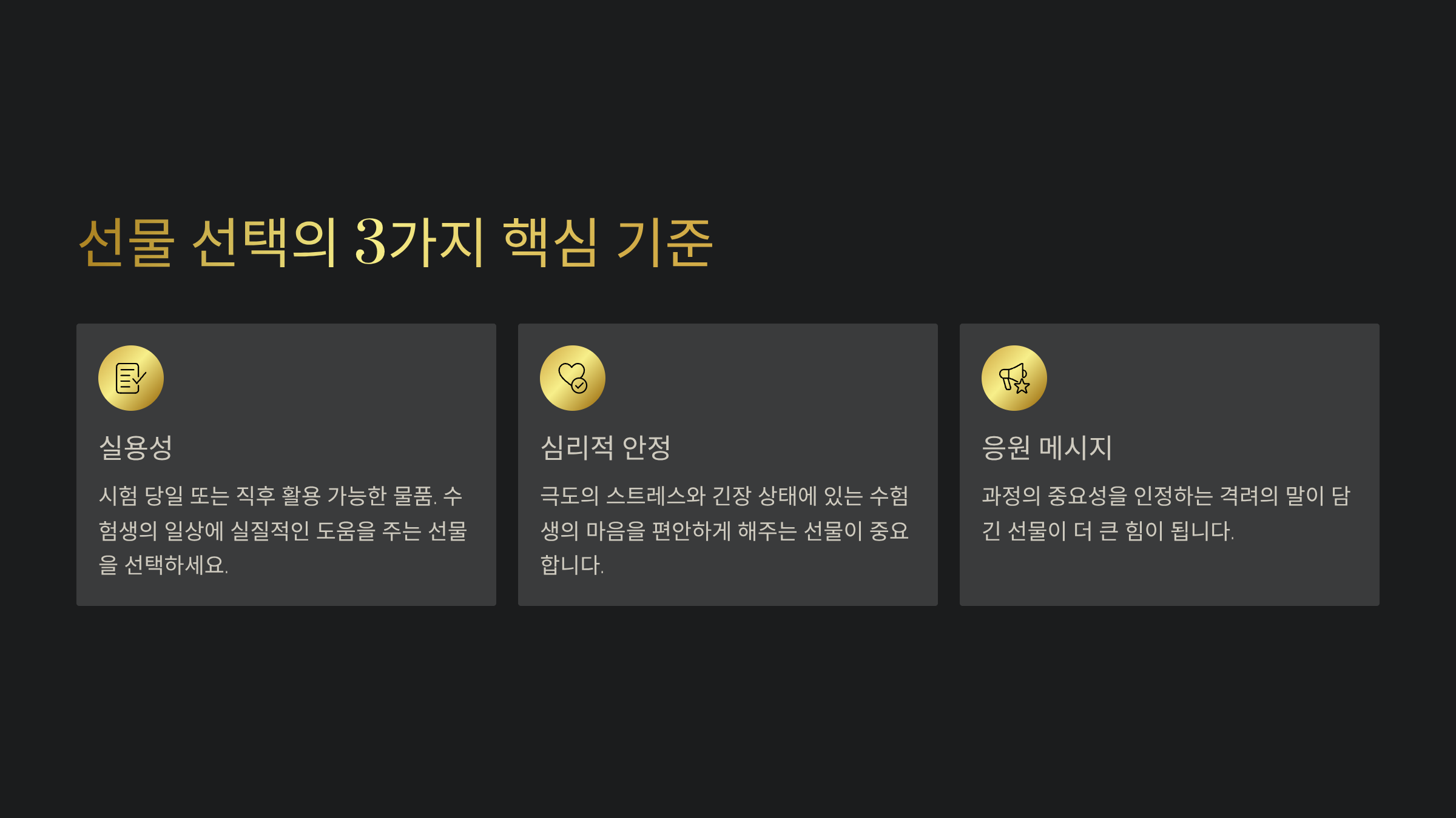 성공적인 수능 선물을 고르기 위해서는 다음 세 가지 핵심 기준을 충족하는지 확인하는 것이 중요합니다.