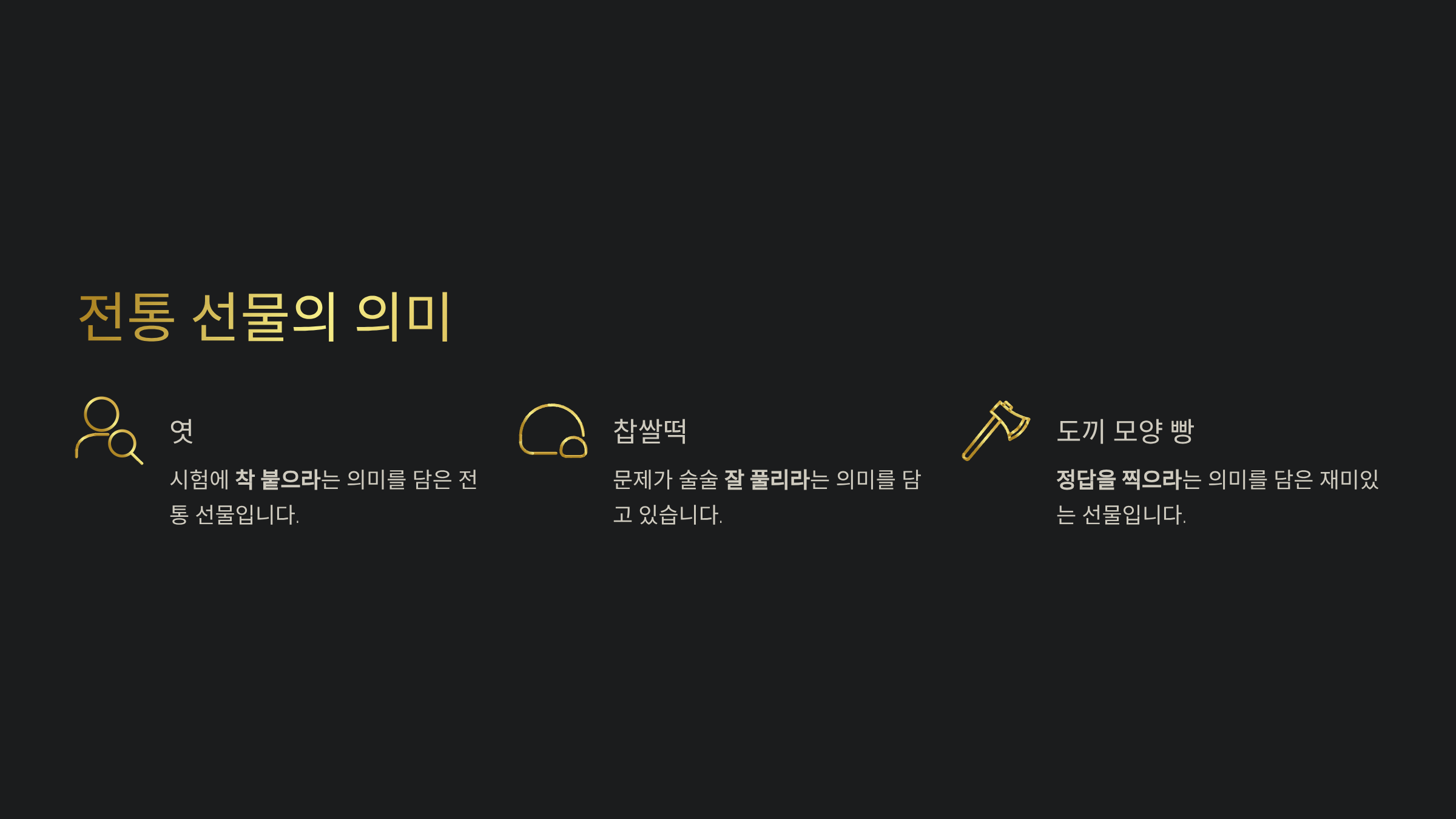 - 엿과 찹쌀떡의 의미: '엿'은 시험에 착 붙으라는 의미가 있으며, '찹쌀떡'은 문제가 술술 잘 풀리라는 의미를 담고 있습니다. 이 외에도 '도끼' 모양 빵은 정답을 찍으라는 의미를 담기도 합니다.
