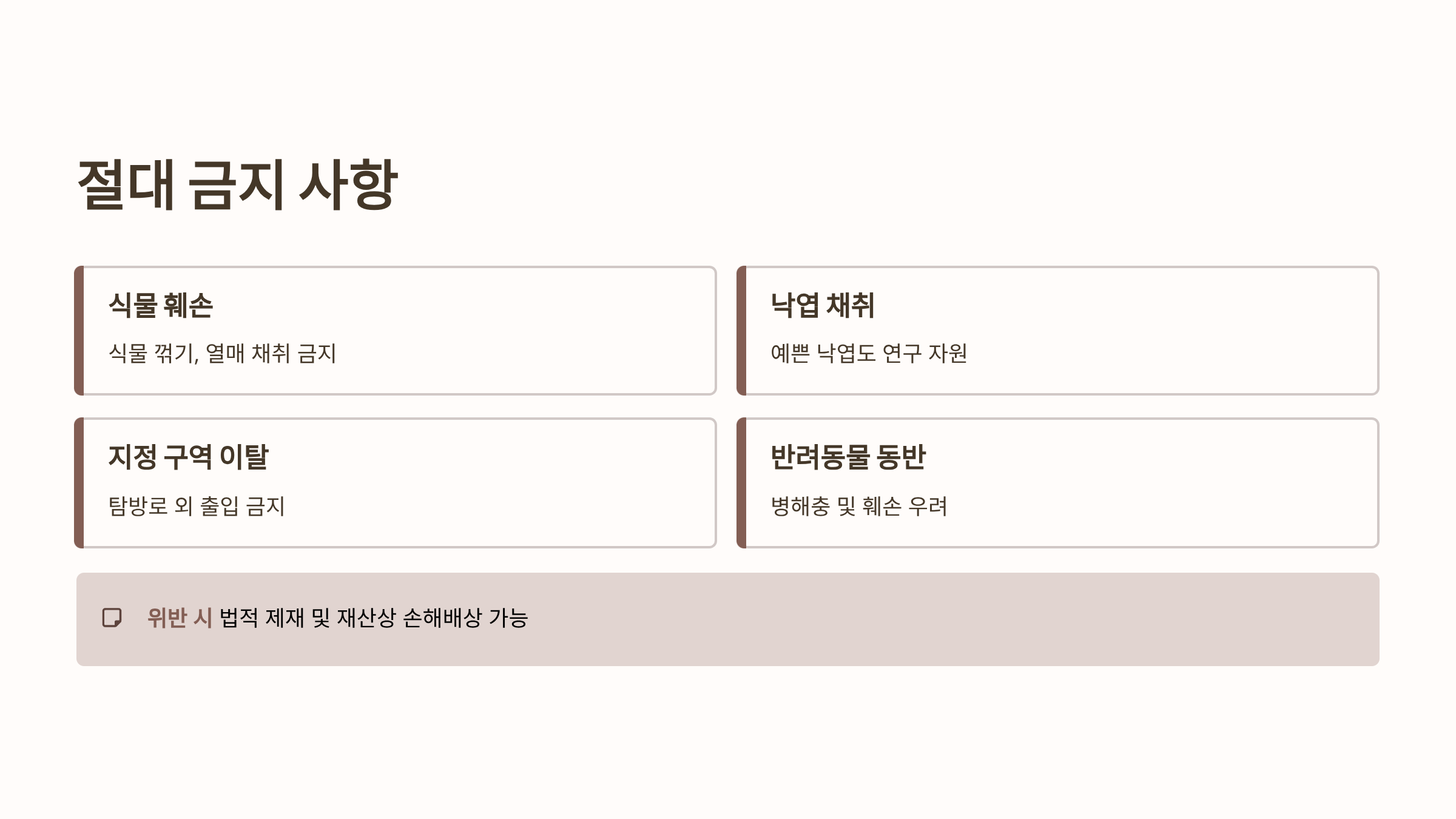 - 반려동물 및 돗자리 금지: 반려동물 동반은 산림 병해충 및 연구 자원 훼손의 우려로 엄격히 금지됩니다. 또한, 돗자리나 텐트 설치 등 취식 및 휴식 공간 점유 행위도 금지됩니다.