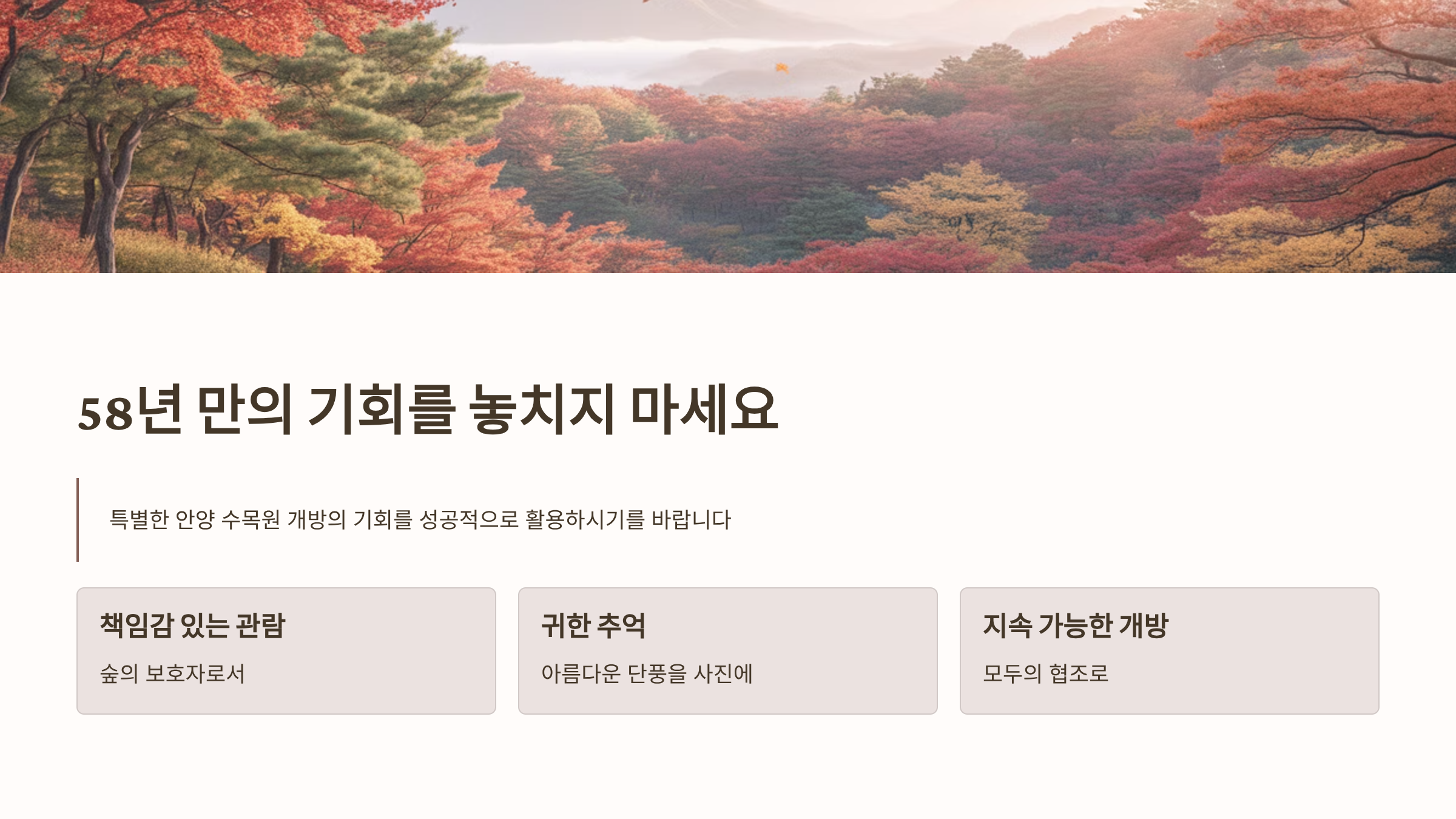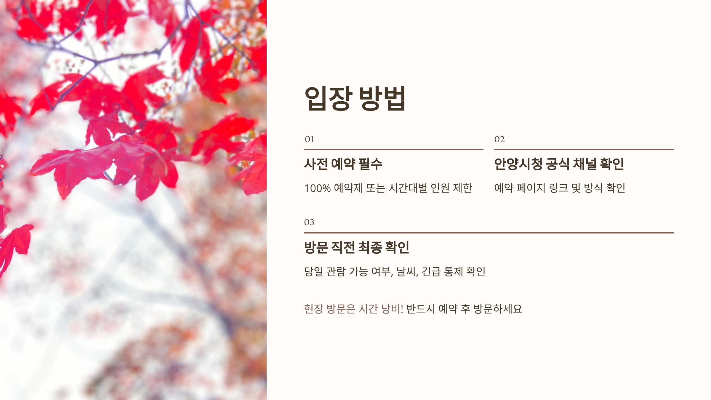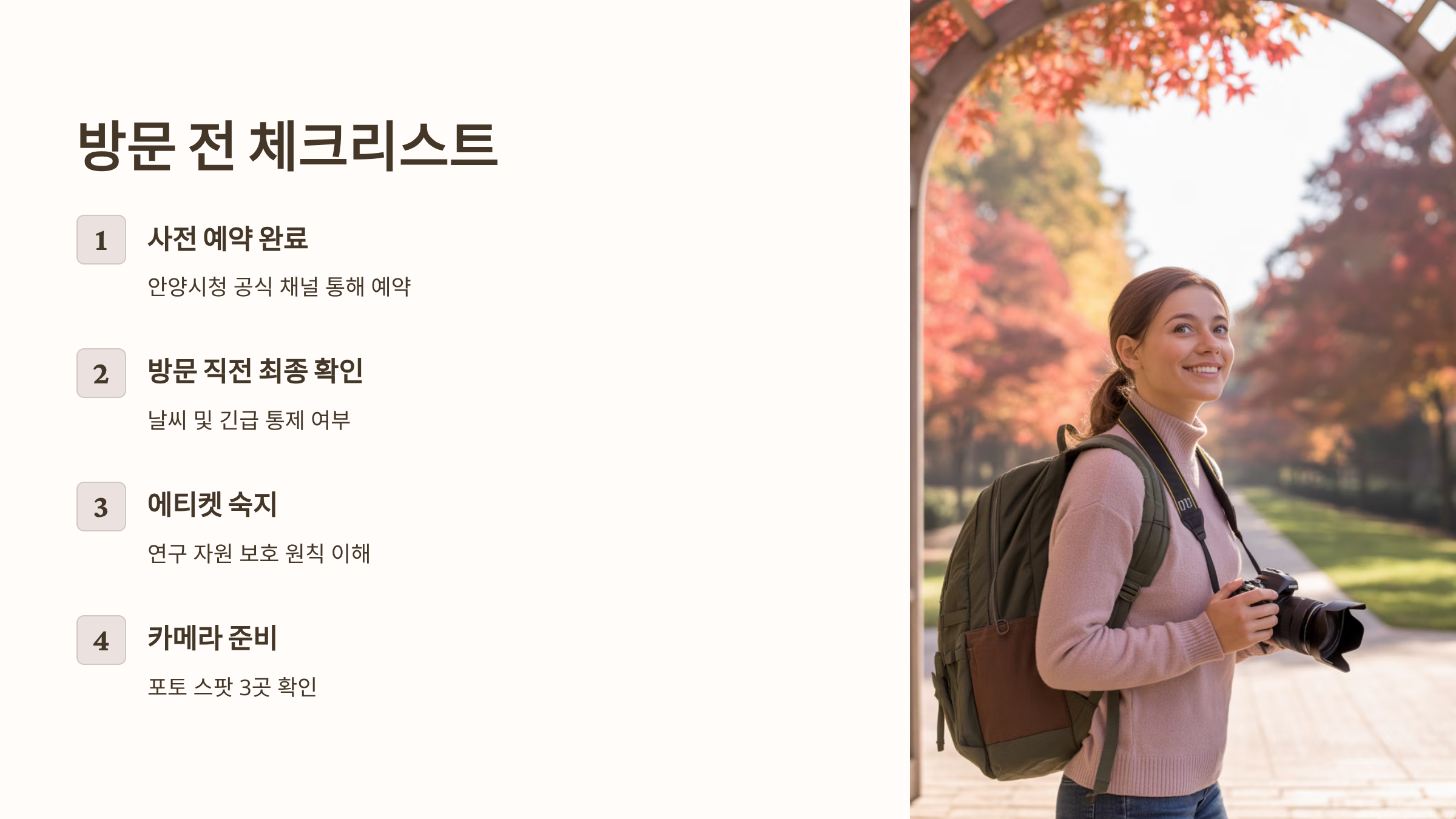 - 방문 시기 최종 확인 절차: 개방 일정이 확정된 후라도, 방문 직전 안양시청 또는 수목원 공식 채널을 통해 당일의 관람 가능 여부, 날씨, 그리고 혹시 모를 긴급 통제 여부를 확인해야 합니다. 특히 단풍철은 변동성이 크므로 최종 확인이 필수입니다.