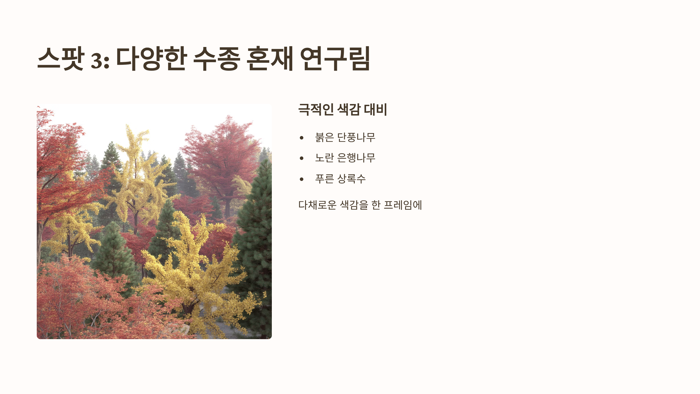 - 다양한 수종이 혼재된 연구림 경계: 인위적으로 식재된 연구림의 경계에서는 붉은 단풍나무, 노란 은행나무, 푸른 상록수가 극적으로 대비되는 다채로운 색감을 한 프레임에 담을 수 있습니다.