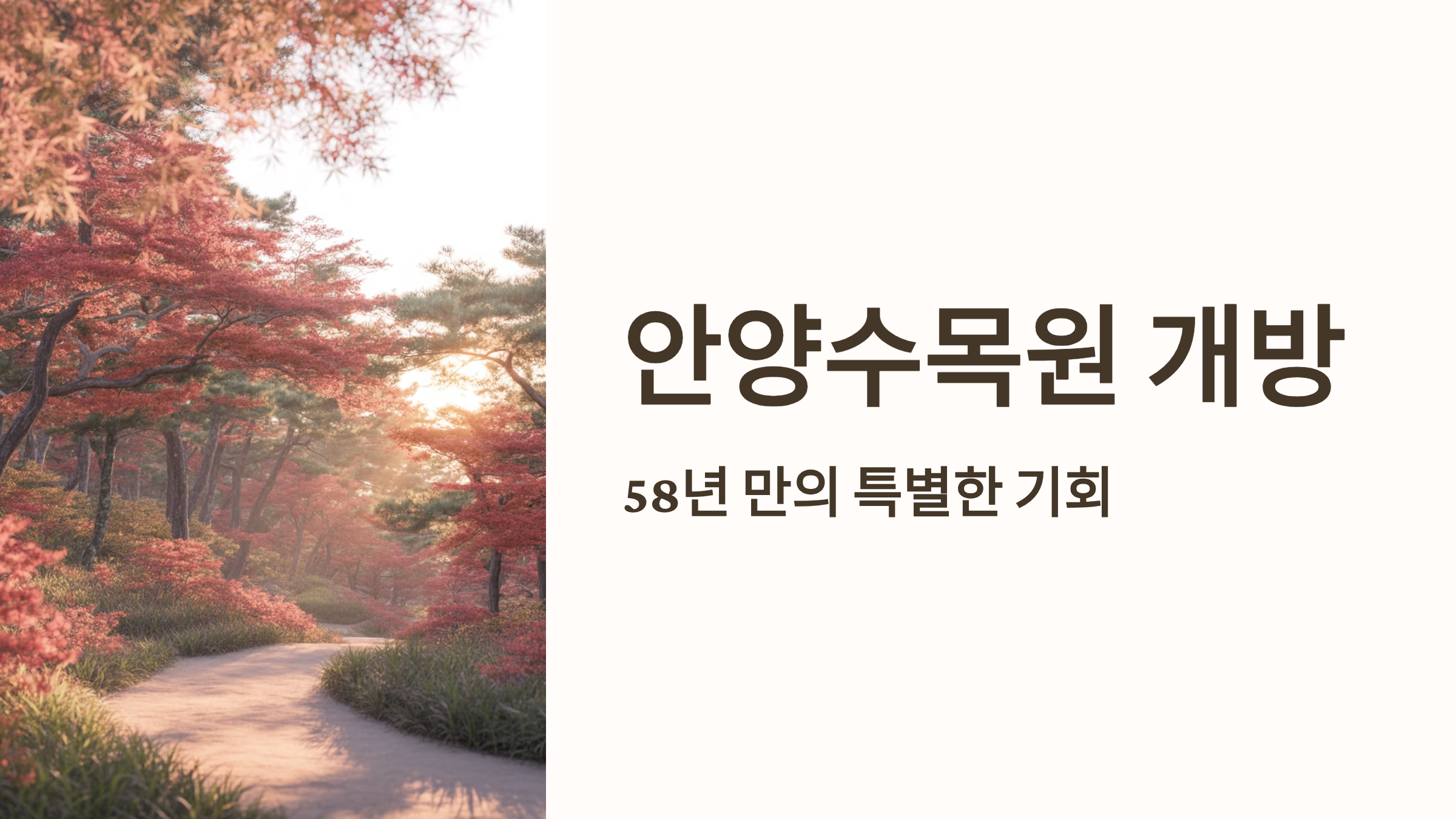 안양 수목원 개방은 일반인에게는 단순한 산책로 개방을 넘어, 수십 년간 닫혀 있던 자연의 보고를 잠시나마 엿볼 수 있는 역사적인 기회입니다. 1960년대부터 서울대학교의 연구 시설로 운영되며 외부인의 출입이 엄격히 통제되었기에, 이 숲길이 열리는 것은 매우 특별한 일입니다. 당신이 지금 '안양 수목원 개방'을 검색한 것은, 이 58년 만의 귀한 기회를 놓치지 않고, 연구용으로 가꿔진 아름다운 단풍을 직접 보고 싶기 때문일 것입니다. 이 글은 수목원의 역사적 개방 의미를 되새기며, 이 특별한 단풍 명소를 가장 책임감 있고 안전하게 구경하는 방법과, 귀한 풍경을 놓치지 않고 담아내는 실용적인 팁을 안내해 드리겠습니다.