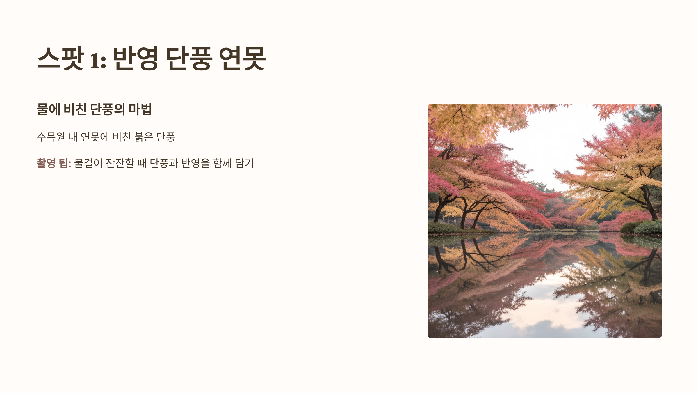 - 반영 단풍 연못 스팟: 수목원 내부에 위치한 연못이나 물웅덩이는 주변 단풍나무의 붉은색을 그대로 비춥니다. 물결이 잔잔할 때 단풍과 그 반영을 함께 담으면 깊이 있는 인생샷을 얻을 수 있습니다.