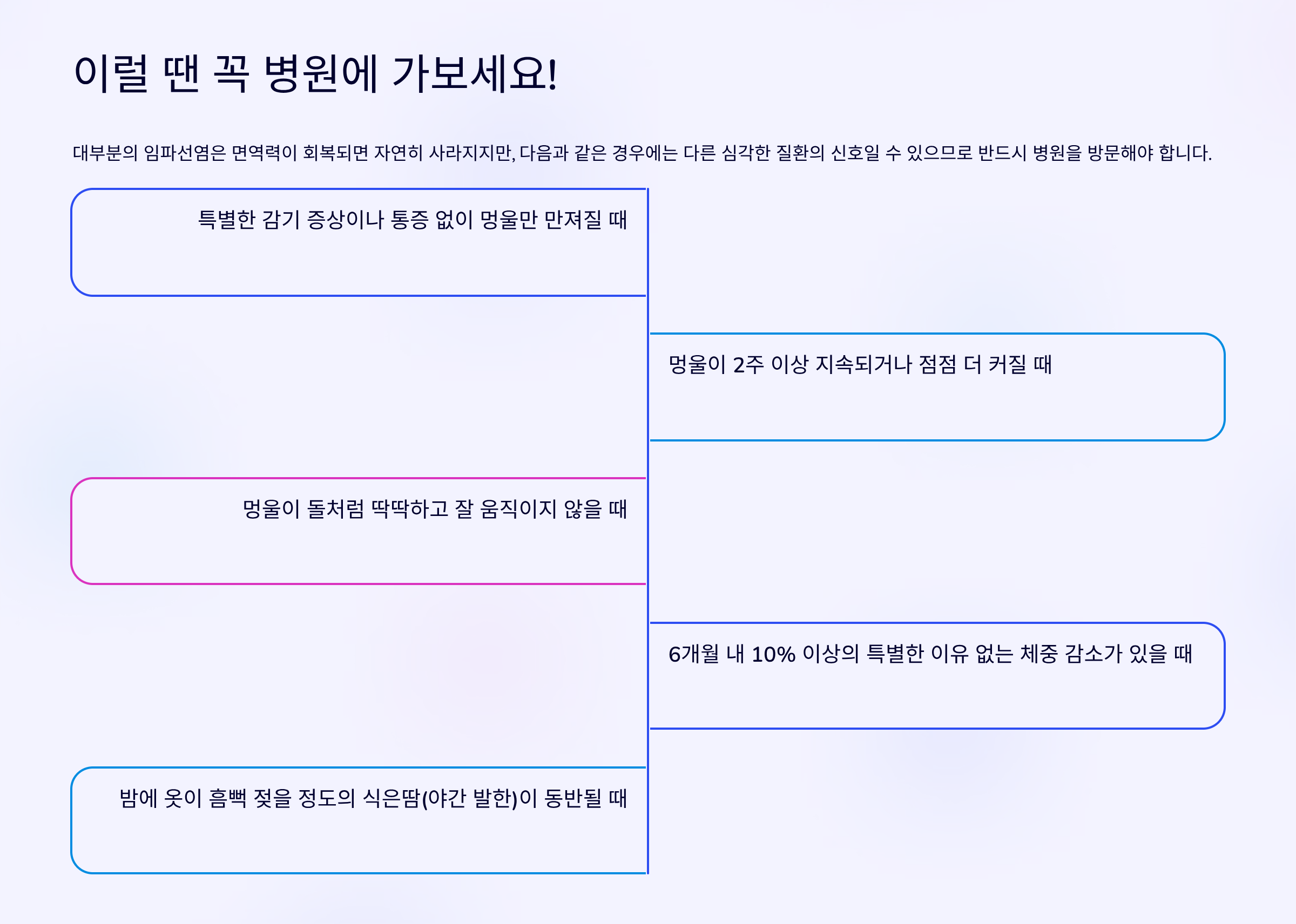 대부분의 임파선염은 면역력이 회복되면 자연히 사라지지만, 다음과 같은 경우에는 다른 심각한 질환의 신호일 수 있으므로 반드시 병원(이비인후과, 내과)을 방문해 정확한 진단을 받아야 합니다.