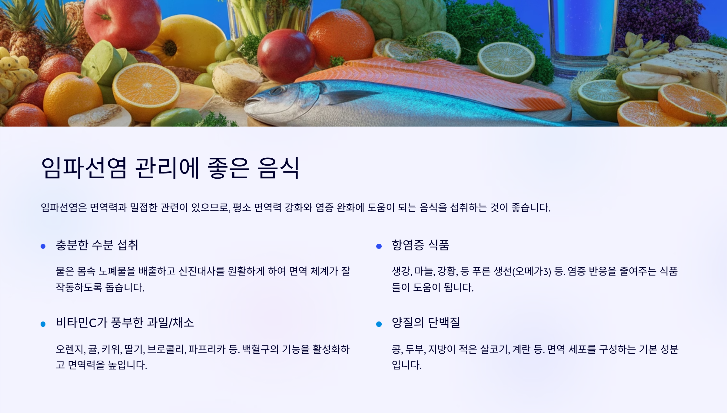 임파선염은 면역력과 밀접한 관련이 있으므로, 평소 면역력 강화와 염증 완화에 도움이 되는 음식을 섭취하는 것이 좋습니다.