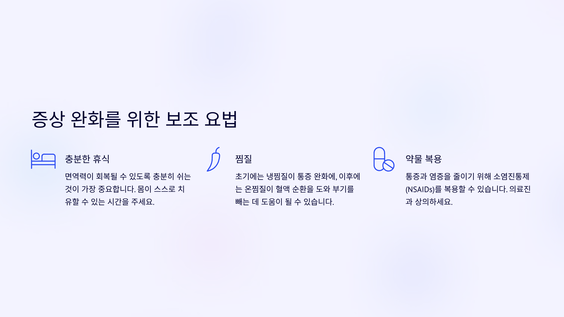 - 약물: 통증과 염증을 줄이기 위해 소염진통제(NSAIDs)를 복용할 수 있습니다.
