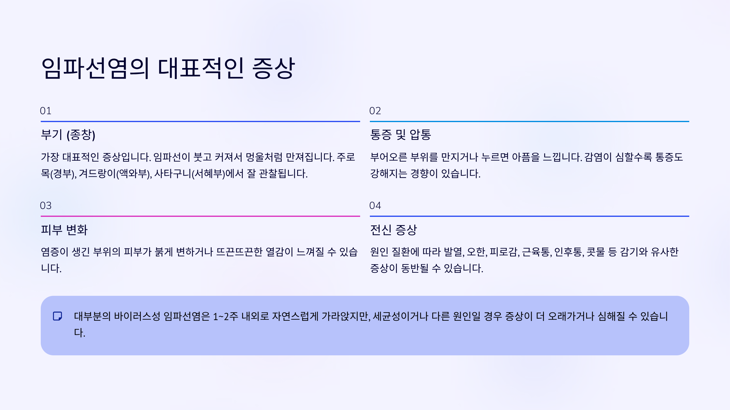 오늘은 우리 몸의 면역 신호, '임파선염'에 대해 알아보았습니다. 임파선이 붓는 것은 대부분 우리 몸이 열심히 싸우고 있다는 긍정적인 신호입니다.
