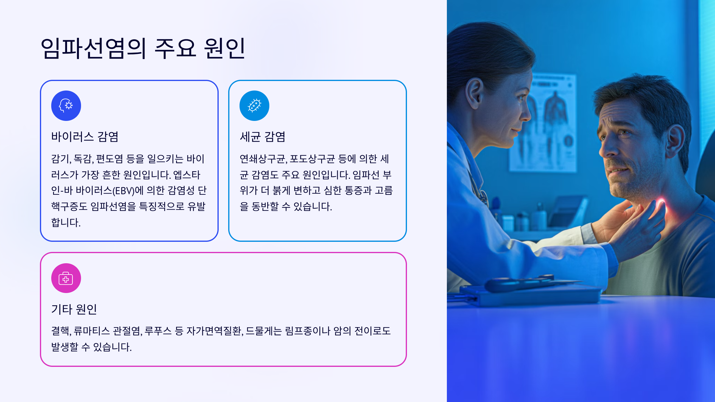 임파선은 전신에 분포하며 우리 몸에 침입한 세균이나 바이러스와 싸우는 면역 기관입니다. 임파선염은 이 임파선이 감염이나 기타 원인으로 인해 염증을 일으켜 붓고 아픈 상태를 말합니다.