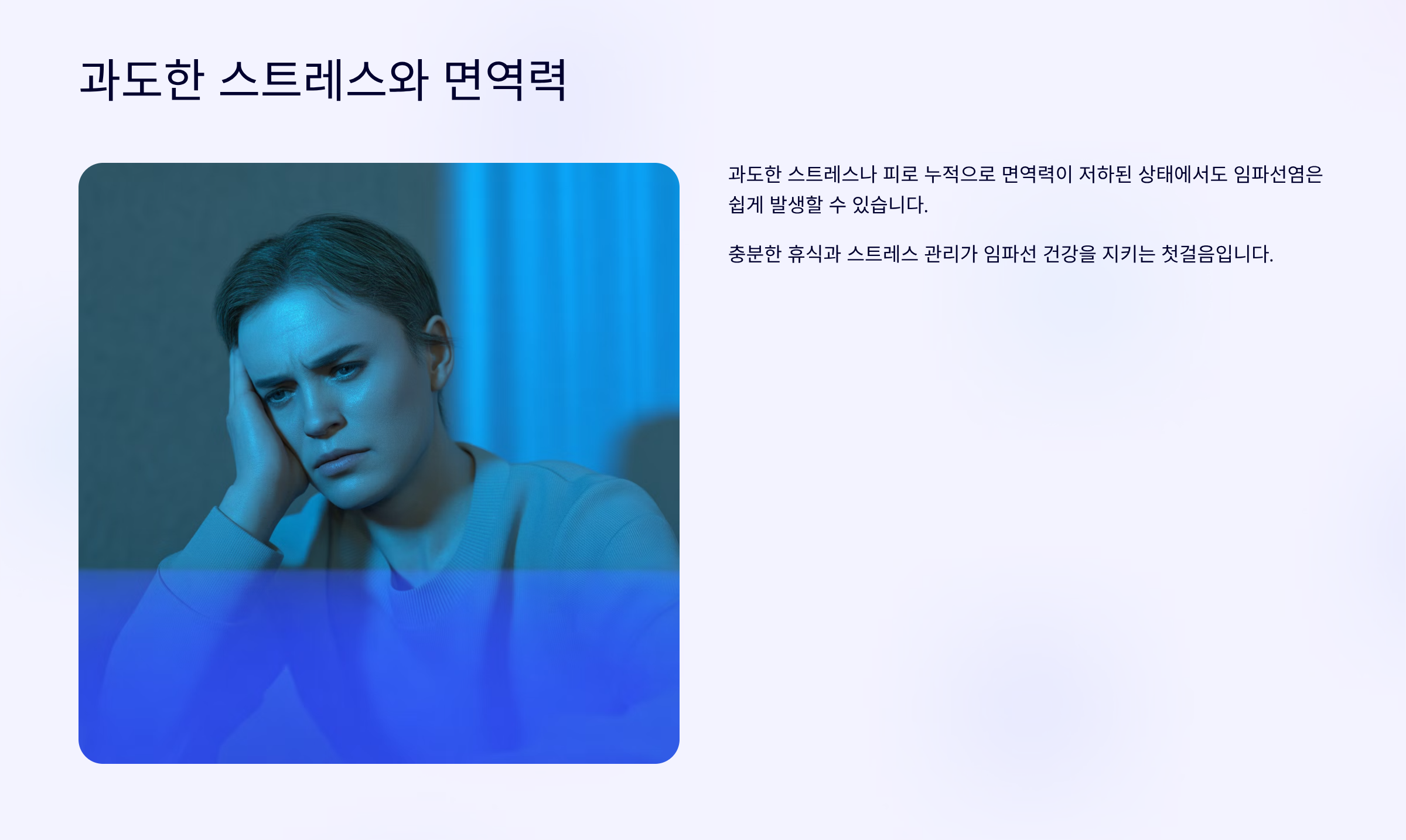 과도한 스트레스나 피로 누적으로 면역력이 저하된 상태에서도 임파선염은 쉽게 발생할 수 있습니다.